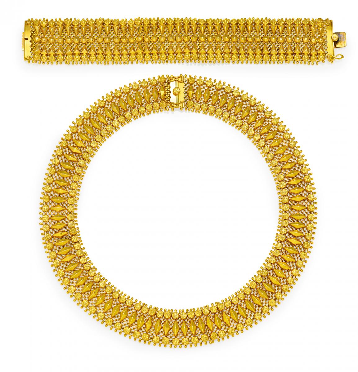 750/- Gelbgold, Gesamtgewicht: 131,0g. Collier L.ca. 46,2cm, A.band L.ca. 19,3cm.