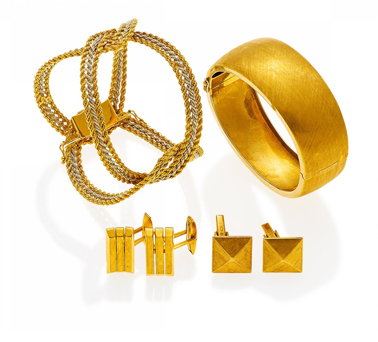 KONVOLUT: ZWEI ARMSPANGEN UND ZWEI PAAR MANSCHETTENKNÖPFE.