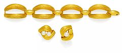 A.band: 585/-Gelbgold. Brosche und Ring: 750/-Gelbgold, Gesamtgewicht: 110,5g. EU-RM: 56. A.band L.ca. 19,0cm, Brosche L x B=ca. 2,8 x 2,5cm. 3 Süßwasser-Zuchtperlen, D.ca. 7,2-7,7mm, weiß-creme-irisierendes rosé.