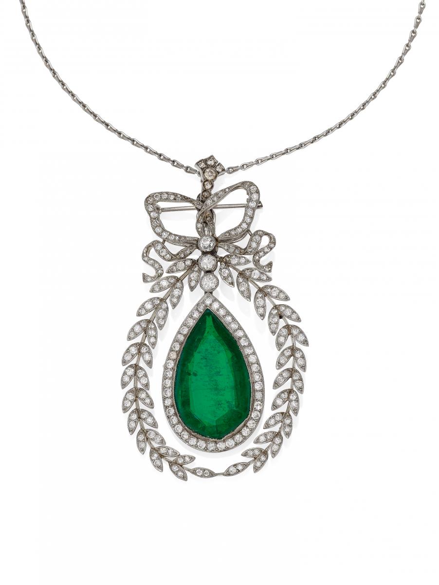 900/- Platin, Kette: 585/- Weißgold, Gesamtgewicht: 26,5g. Anhänger H x B=ca. 6,2 x 3,6cm. Ca. 174 Diamanten im Alt-/ Rosen- und 8/8-Schliff zus.ca. 1,4ct, 1 facettierter, synthetischer Smaragd-Tropfen als Überzug auf einem farblosen Beryll D.ca. 25,2x14,9x7,8mm.