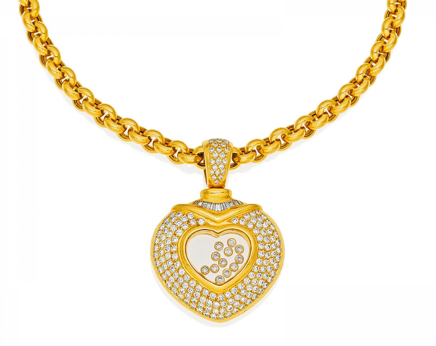 750/- Gelbgold, Glaseinlage, Gesamtgewicht: 68,0g. Anhänger H x B=ca. 5,0 x 3,6cm, Kette L.ca. 47,4cm. Vielzählige Diamanten im Brillant-, Baguette- und Trapezschliff zus.ca. 2,6ct.