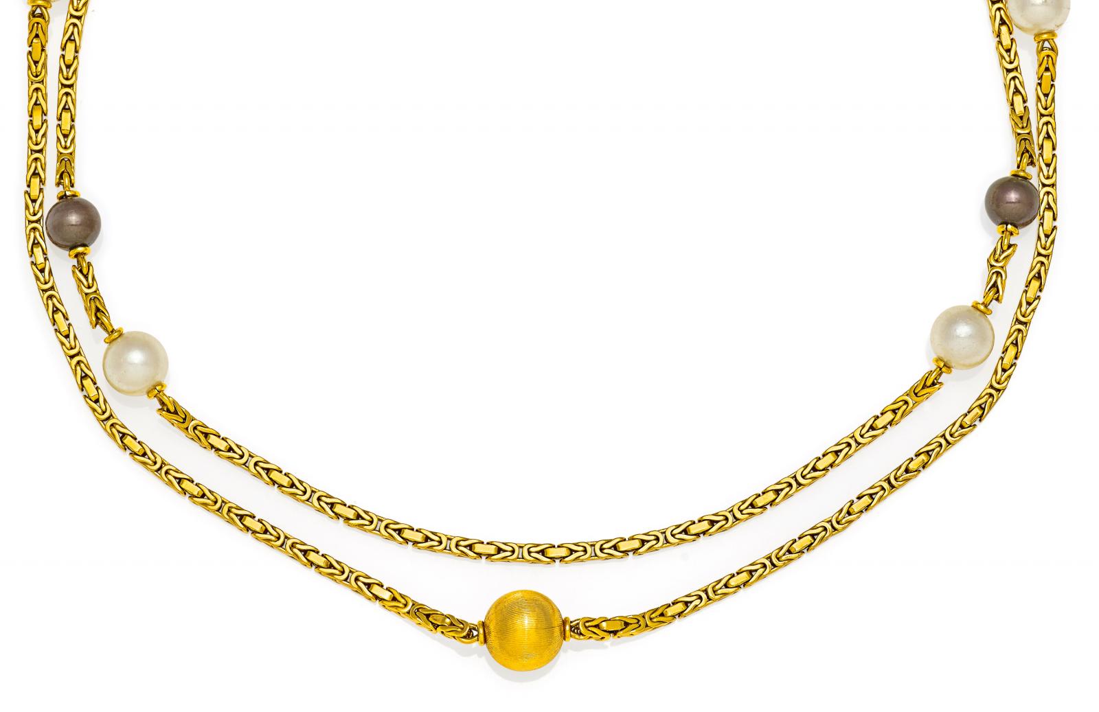 750/- Gelbgold, Gesamtgewicht: 122,5g. L.ca. 81,5- 83,5cm. 12 Akoya- und Tahiti-Zuchtperlen, D.ca. 7,3 - 8,9mm, weiß-creme-peacock.
