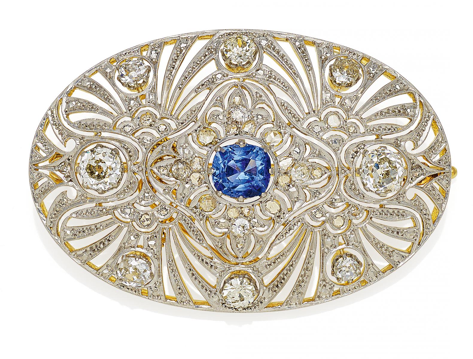 585/- Gelbgold, Silberverbödung, Gesamtgewicht: 20,0g. H x B=ca. 5,2 x 3,5cm. 8 Altschliff-Diamanten und 30 Diamantrosen zus.ca. 2,1ct, 1 leicht oval facettierter Saphir ca. 1,0ct, synthetisch.