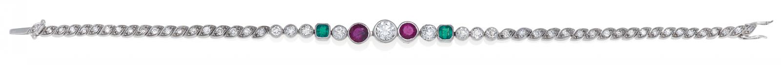 760/- Weißgold, Gesamtgewicht: 17,0g. L.ca. 19,0cm. 48 Diamanten im Alt-/ 8/8- und Brillantschliff zus.ca. 2,0ct I-J/ VS-P1, 2 rund facettierte Rubine zus.ca. 1,5ct, 2 facettierte Smaragd-Karrees zus.ca. 0,6ct.