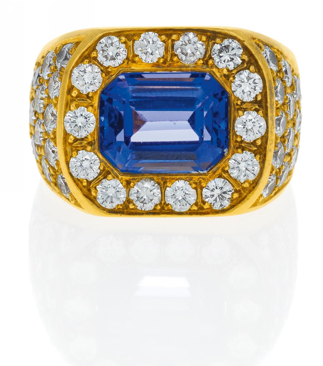 750/- Gelbgold, Meisterpunze HS, Gesamtgewicht: 31,0g. EU-RM: 64. 44 Brillanten zus.ca. 4,4ct H/ VVS-VS, 1 facettierter Tansanit im Emerald Cut ca. 7,4ct.