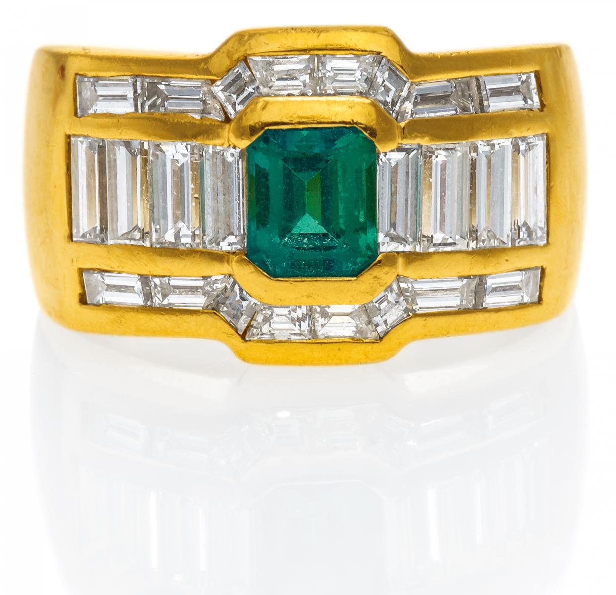 750/- Gelbgold, Gesamtgewicht: 15,0g. EU-RM: 56. 24 Diamanten im Baguette- und Fantasie-Schliff zus.ca. 1,8ct H-I/ VS1-2, 1 facettierte Smaragd-Synthese im Emerald Cut.