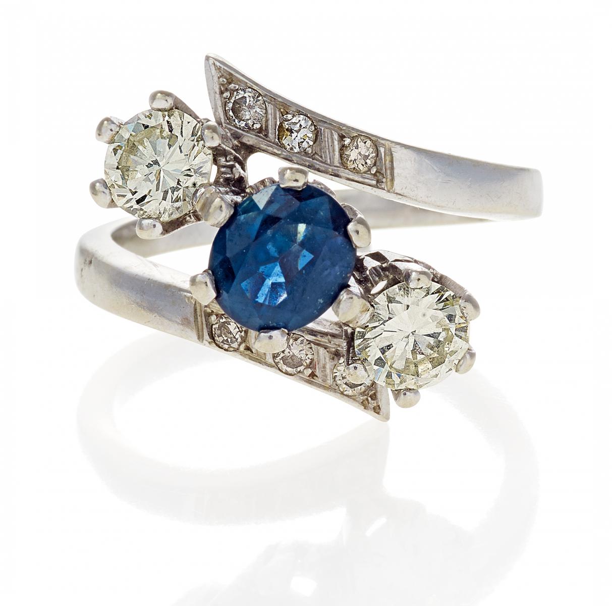 750/- Weißgold, Gesamtgewicht: 6,0g. EU-RM: 52,5. 2 Brillanten zus.ca. 0,8ct M-O/ VS1, 6 winzige Brillanten, 1 oval facettierter Saphir ca. 1,1ct.