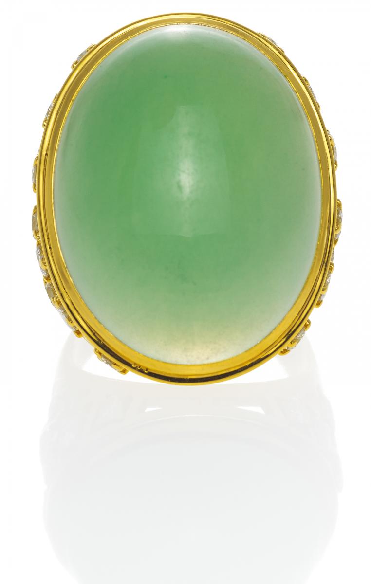 750/- Gelbgold, Gesamtgewicht: 13,5g. EU-RM: 49,5. 18 Brillanten zus.ca. 0,5ct, 1 ovaler Chrysopras-Cabochon D.ca. 23,0x17,9x7,1mm.