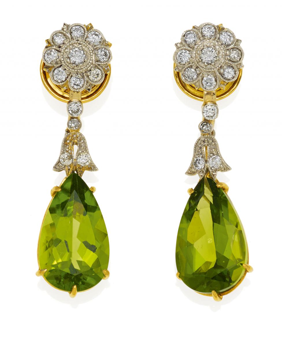 750/- Gelbgold, Platin, Gesamtgewicht: 8,5g. H.ca. 3,8cm. 26 Diamanten im Brillant- und 8/8-Schliff zus.ca. 0,2ct, 2 facettierte Peridot-Tropfen D.ca. 16,1 x 9,6-10,0 x 6,2mm.