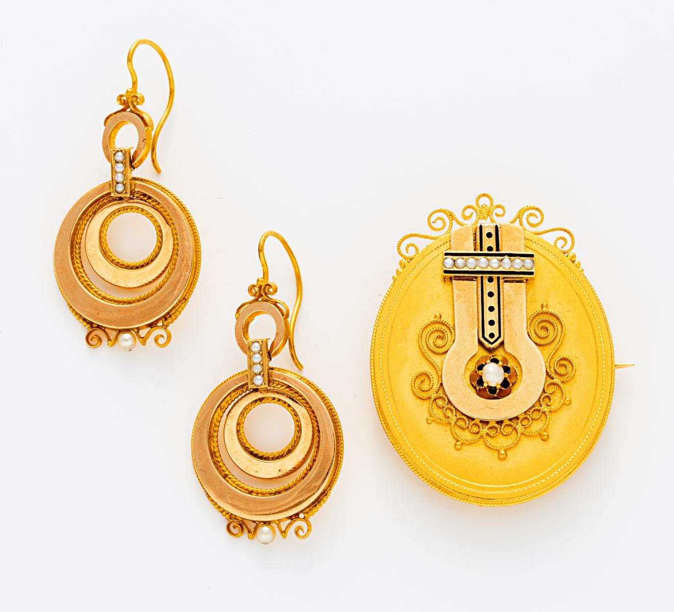Beschreibung: Demi Parure im etruskischen Stil. Brosche und Ohrhänger mit Filigrandraht/-Emaildekor
