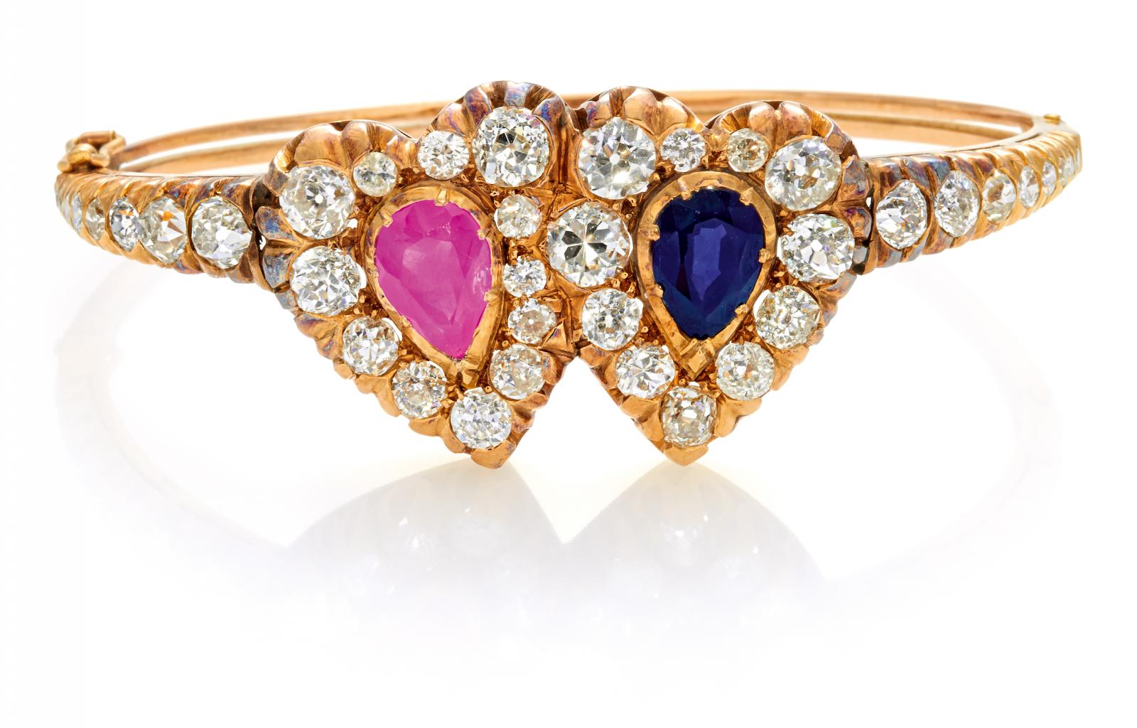 Edelsteine: 1 facettierter synthetischer Saphir-Tropfen ca. 2,0ct, 1 facettierter synthetischer Rubin-Tropfen ca. 2,2ct..