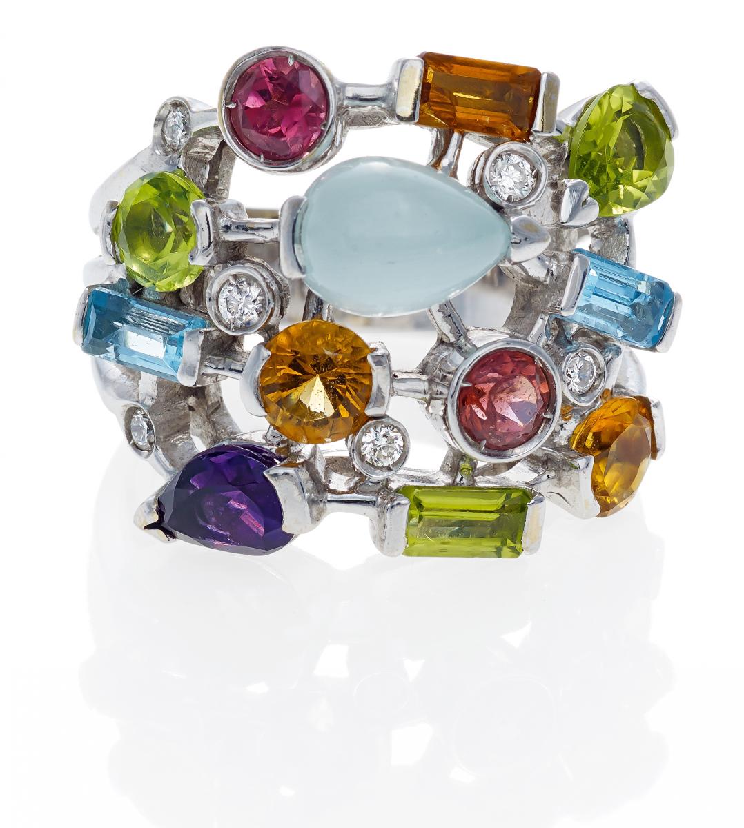 Edelsteine: verschiedene Farbsteine wie Peridot, Citrin, Amethyst, Turmalin und Topas facettiert geschliffen, 1 Chalcedon-Tropfen..