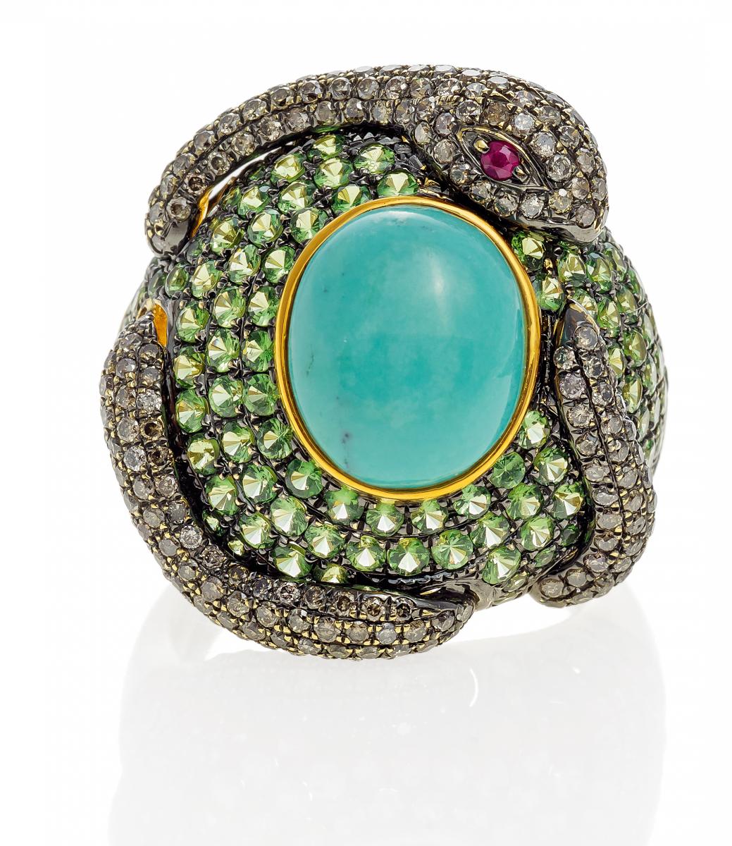 Edelsteine: vielzählige rund facettierte Tsavorite zus.ca. 2,8ct, 2 kleine rund facettierte Rubine, 1 ovaler Türkis-Cabochon D.ca. 11,8 x 9,7 x 4,6mm..