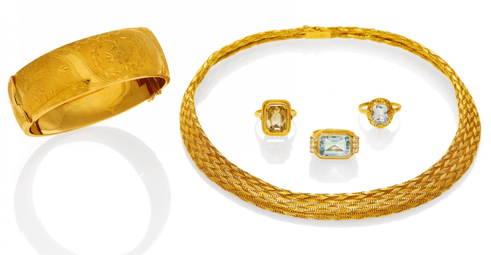 KONVOLUT: GOLD-COLLIER, ARMSPANGE UND DREI FARBSTEIN-RINGE.