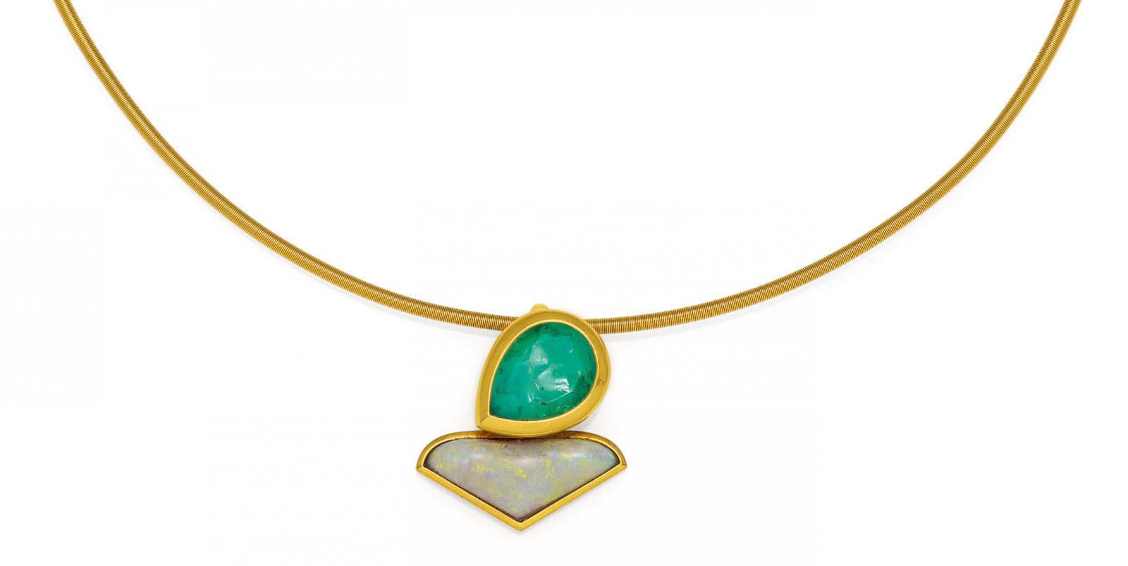 Edelsteine: 1 facettierter Smaragd im Tropfenschliff ca. 5,9ct, 1 fancy cut Opal-Cabochon..
