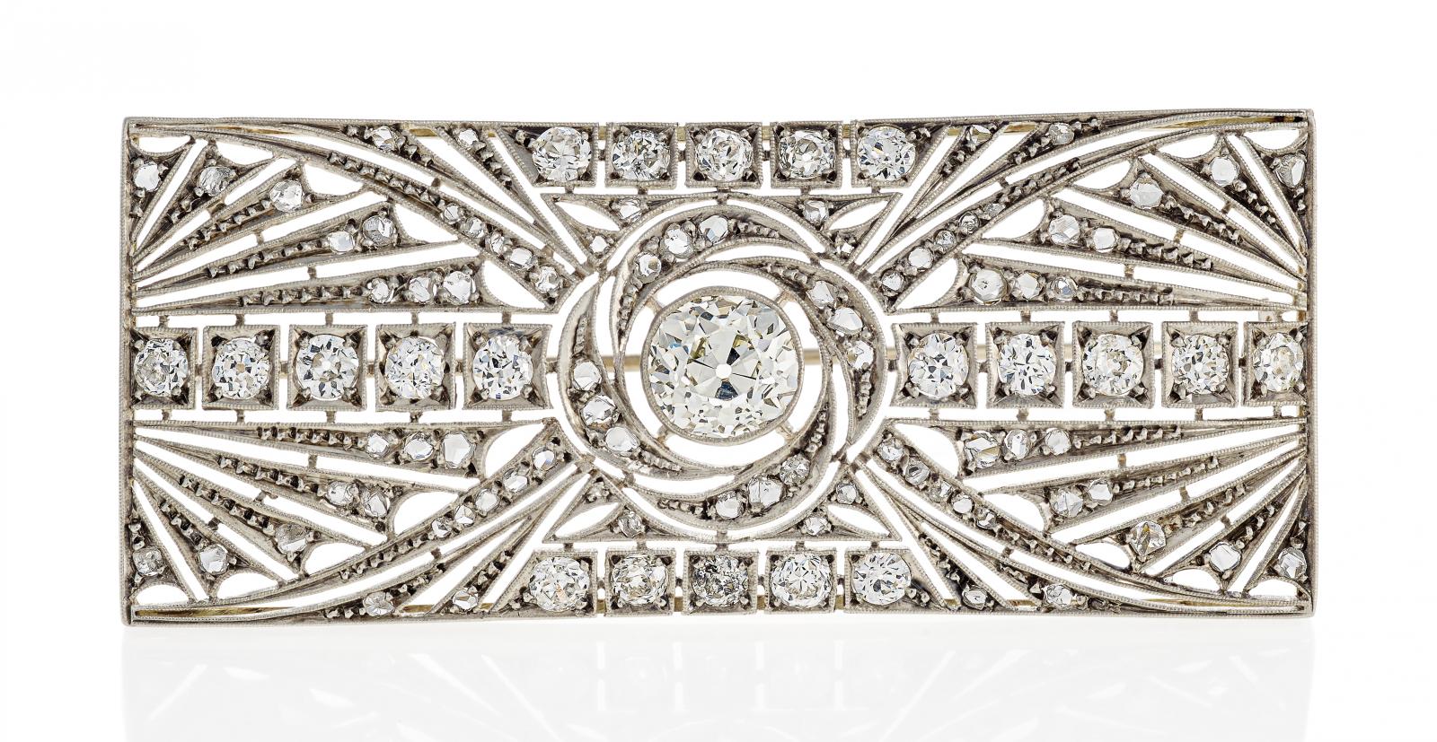 Diamanten: 1 Diamant im Altschliff ca. 2,4ct L/ VS1, ca. 100 Diamanten im Alt- und Rosenschliff zus. ca. 2,5ct M-O/ SI-P..