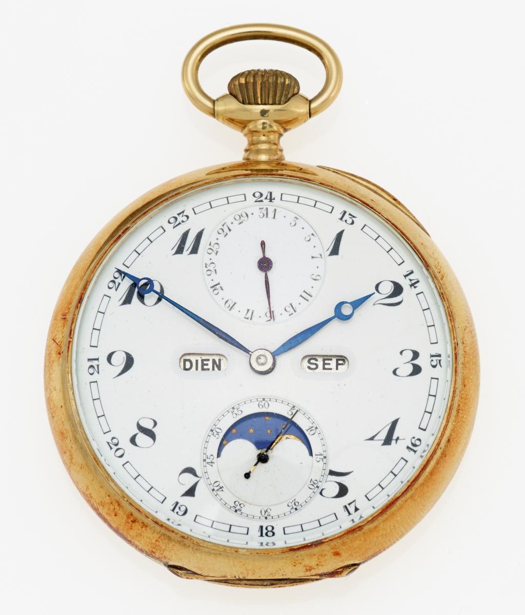 Beschreibung: Seltene Herrentaschenuhr mit Vollkalender.
