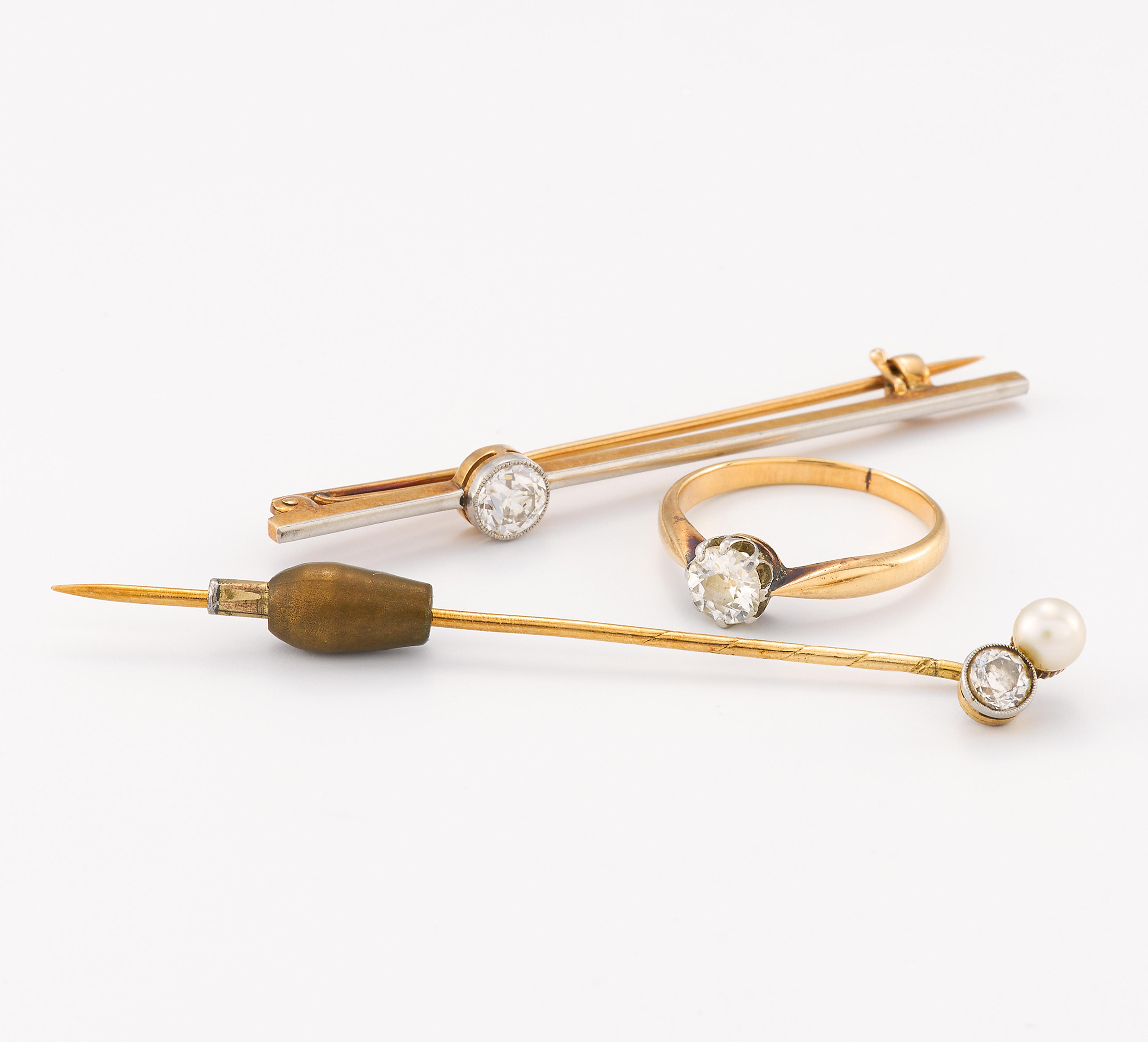 KONVOLUT: EIN RING, EINE KRAWATTENNADEL UND EINE STABNADEL.