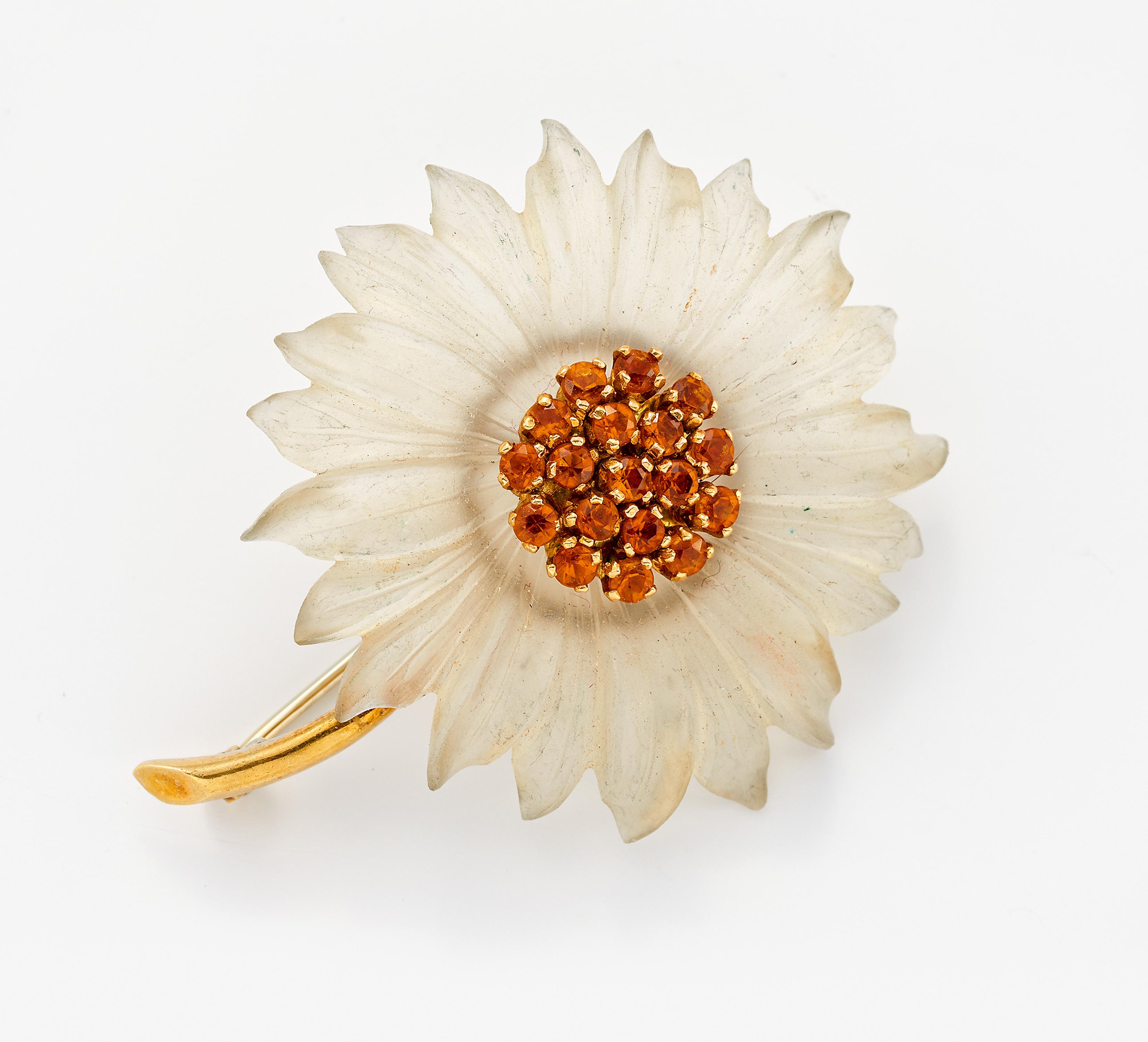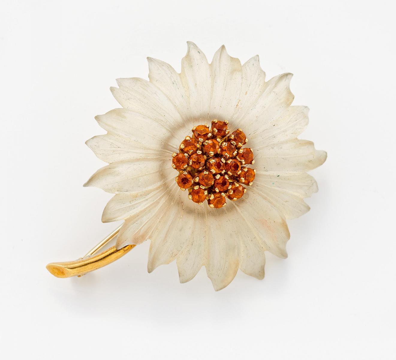 Edelsteine: 18 runde, facettierte orange Farbsteine, 1 geschnitzter Bergkristall..