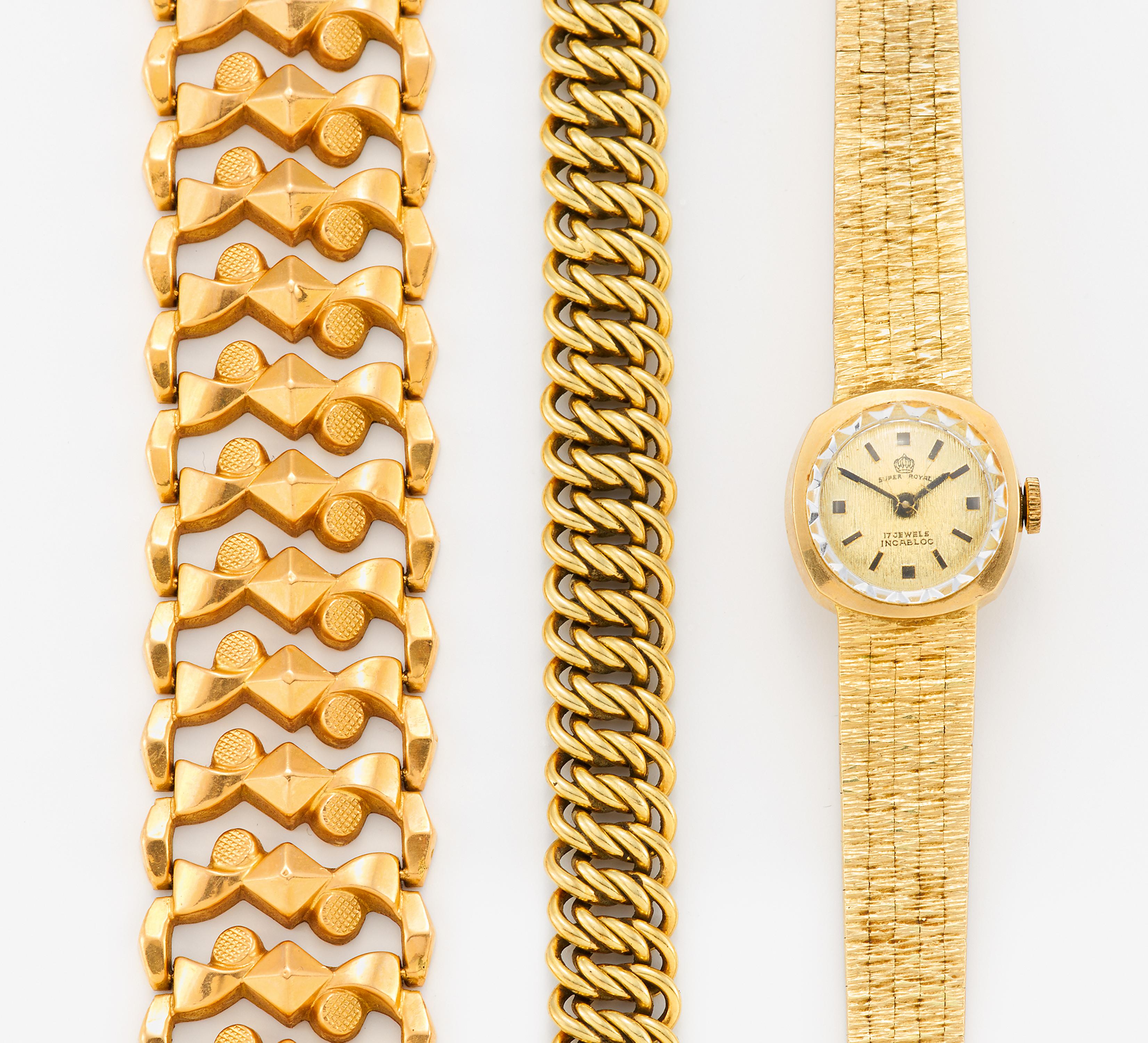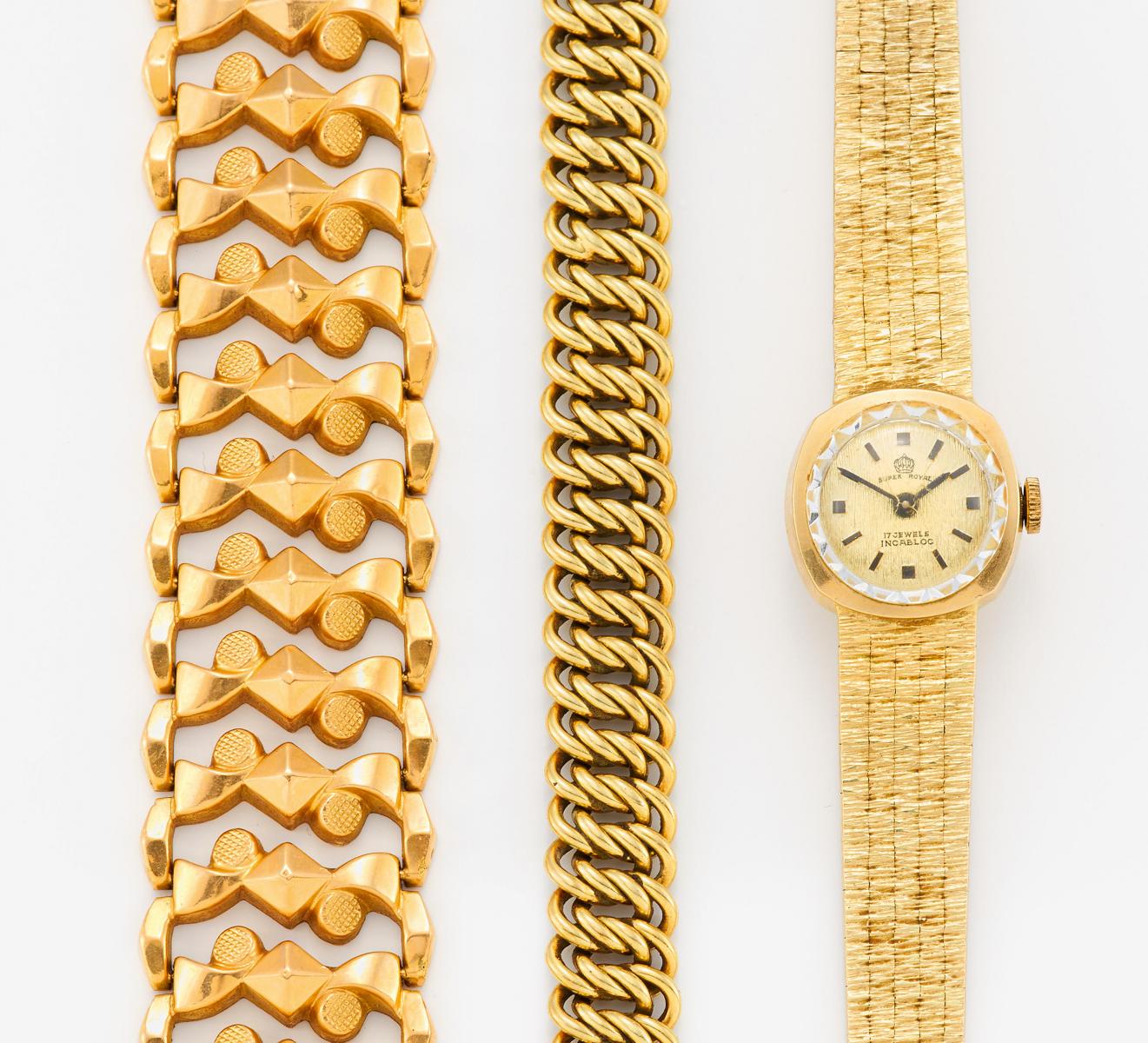 KONVOLUT: DAMENUHR UND ZWEI GOLDARMBÄNDER.