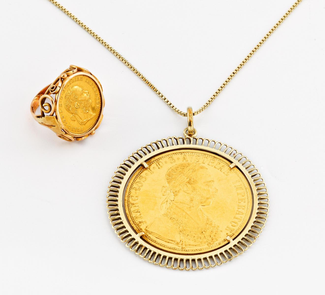 KONVOLUT: MÜNZANHÄNGER-KETTE UND RING.