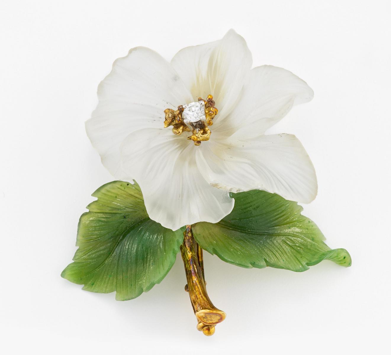 Edelsteine: 2 gravierte Nephrit-Blätter, 1 gravierte Bergkristall-Blüte..