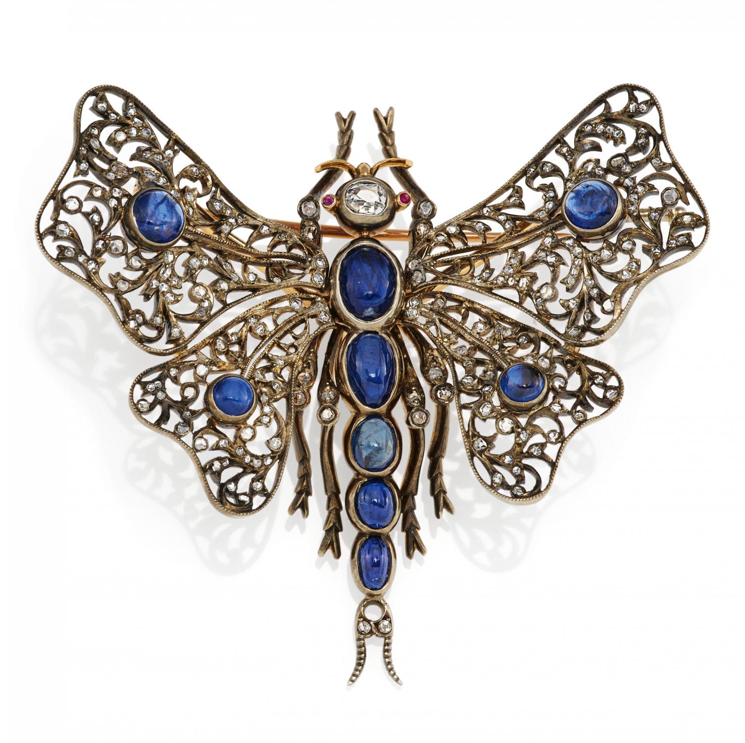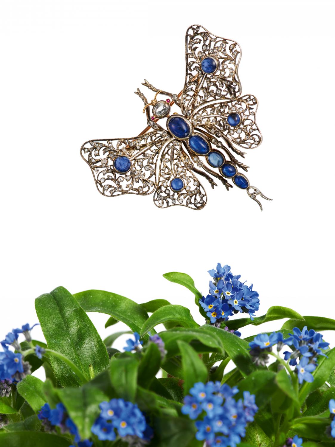 Edelsteine: 9 Saphir-Cabochons zus. ca. 6,5 ct., 2 facettierte, rote Farbsteine.