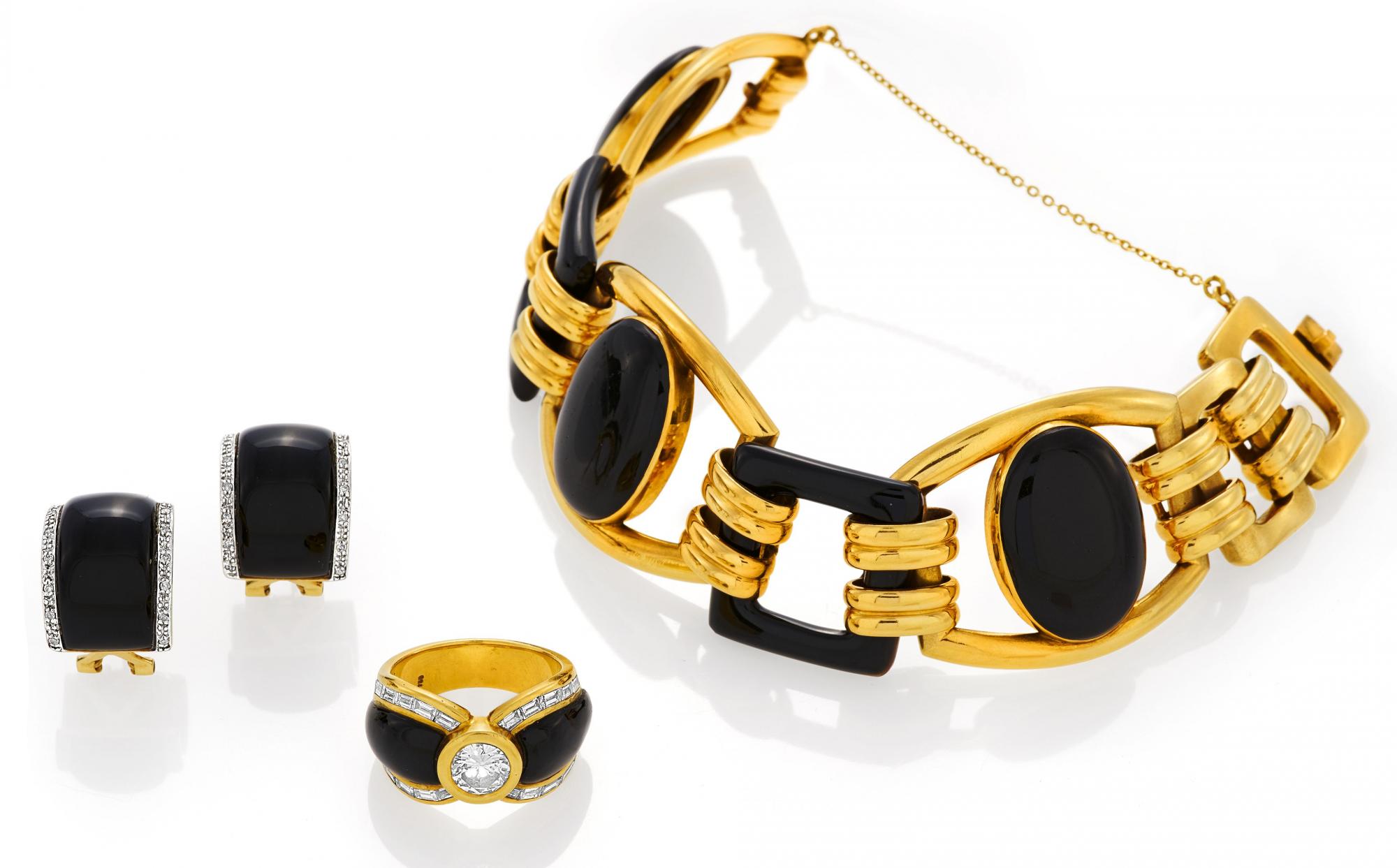 ONYX-DIAMANT-SET: ARMBAND, RING UND OHRSTECKER.
