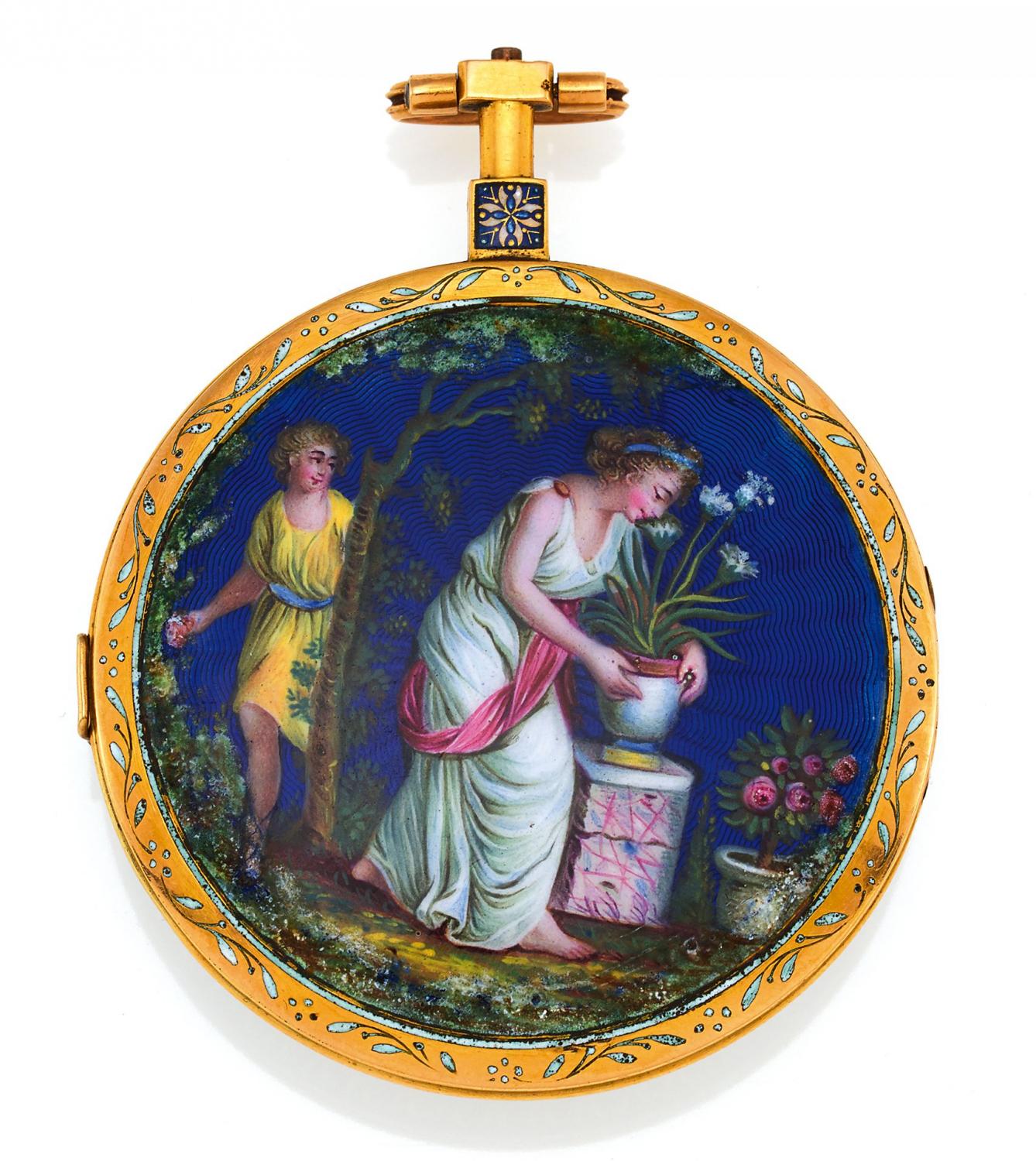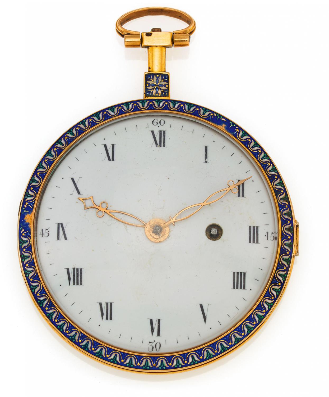 Gehäuse/Armband: Feuervergoldet, emailliert, Zffbl. Email, Zeiger golden.