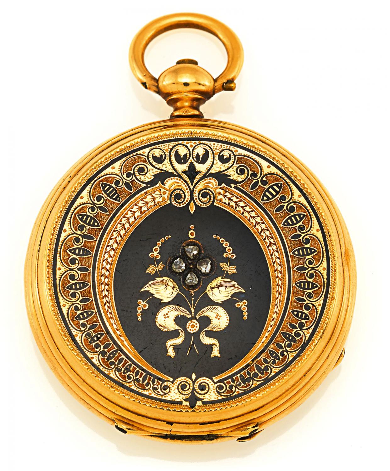 Gehäuse/Armband: 750/- Gelbgold mit Emaildekor und vier Diamantrosen, Zffbl. Email, Zeiger silbern.