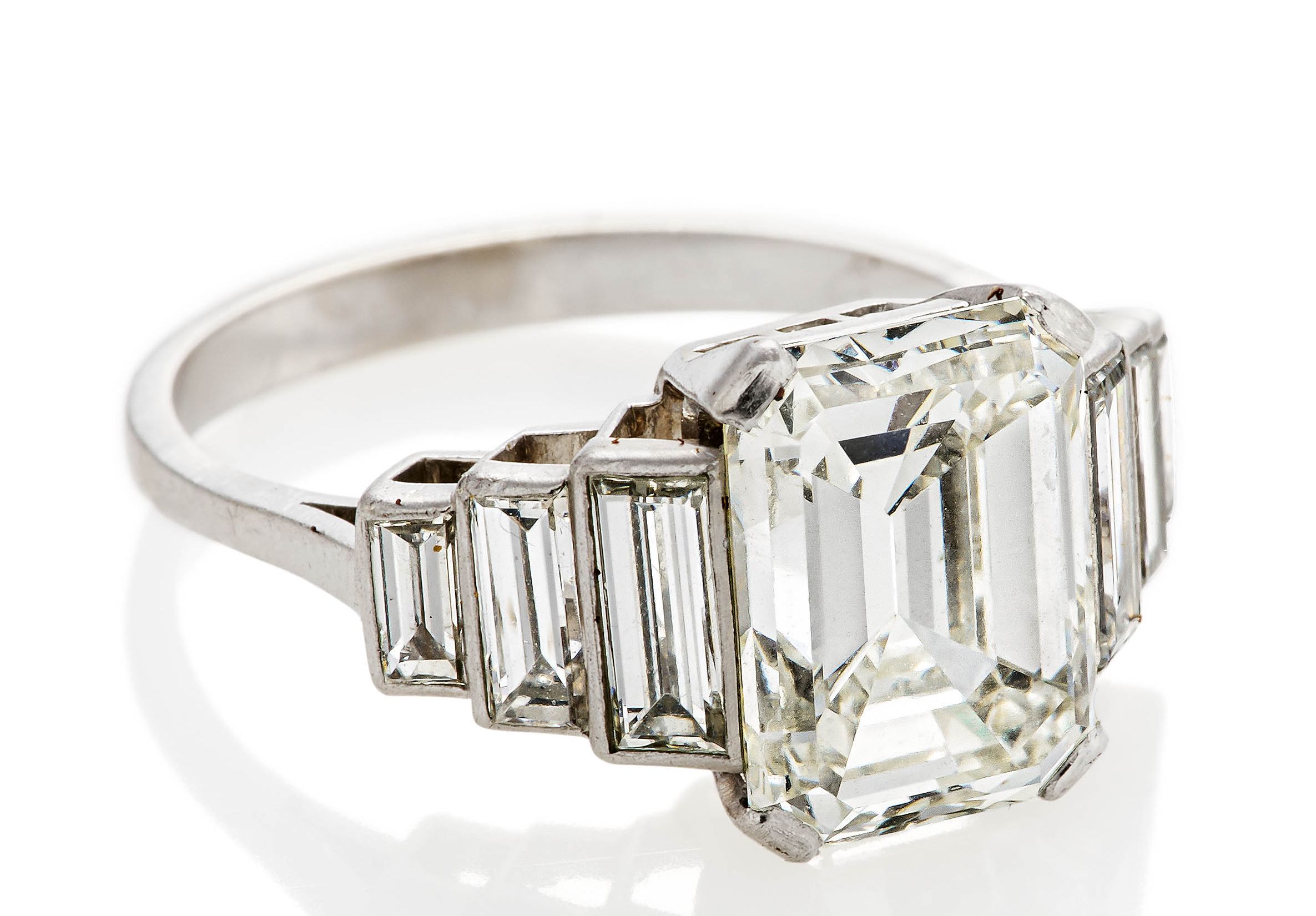 Diamanten: 1 Diamant im Emerald-Schliff ca. 3,7 ct., L-M/VS1, 6 Diamanten im Baguette-Schliff zus. ca. 1,0 ct., L-M/VS.