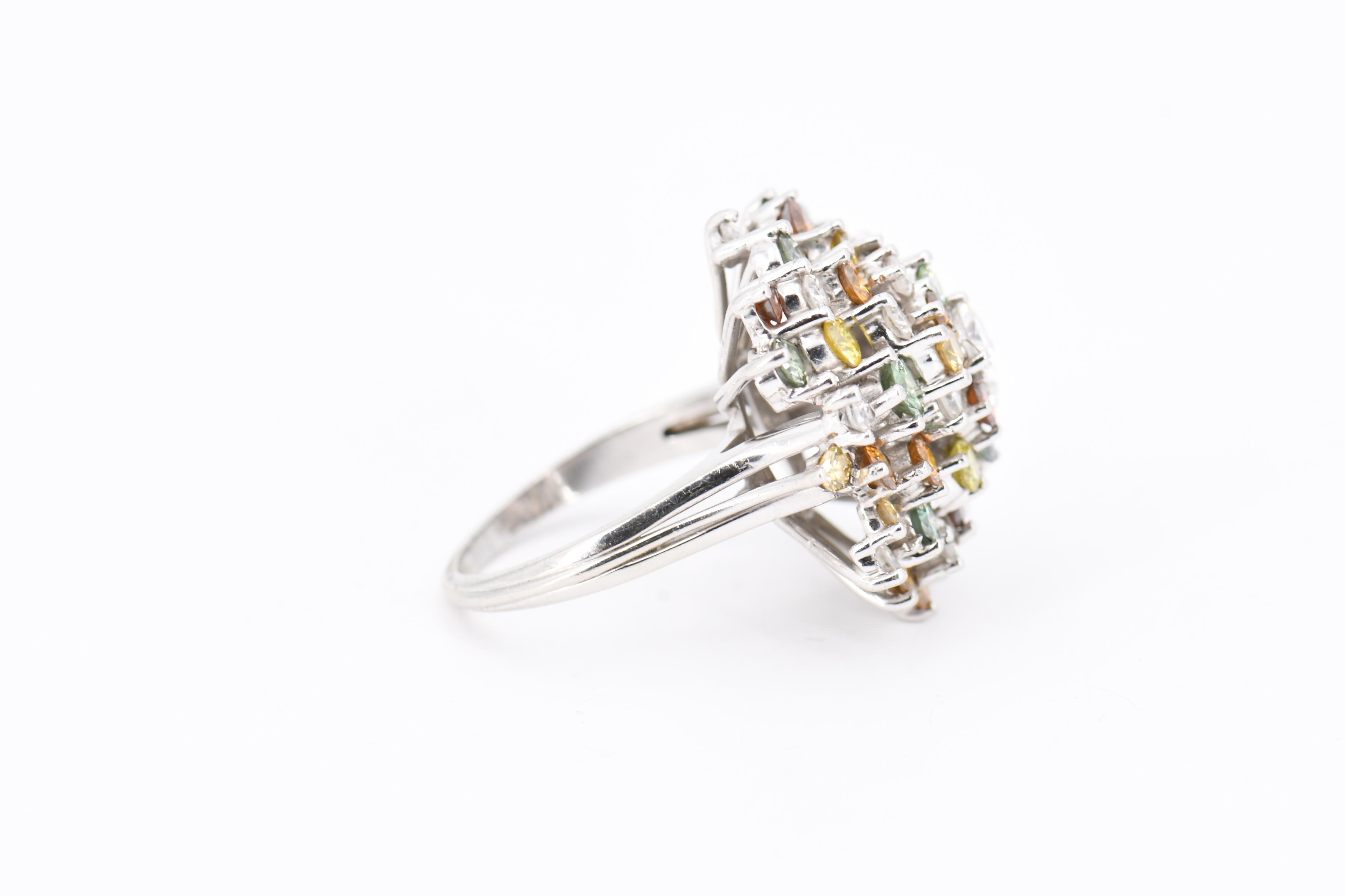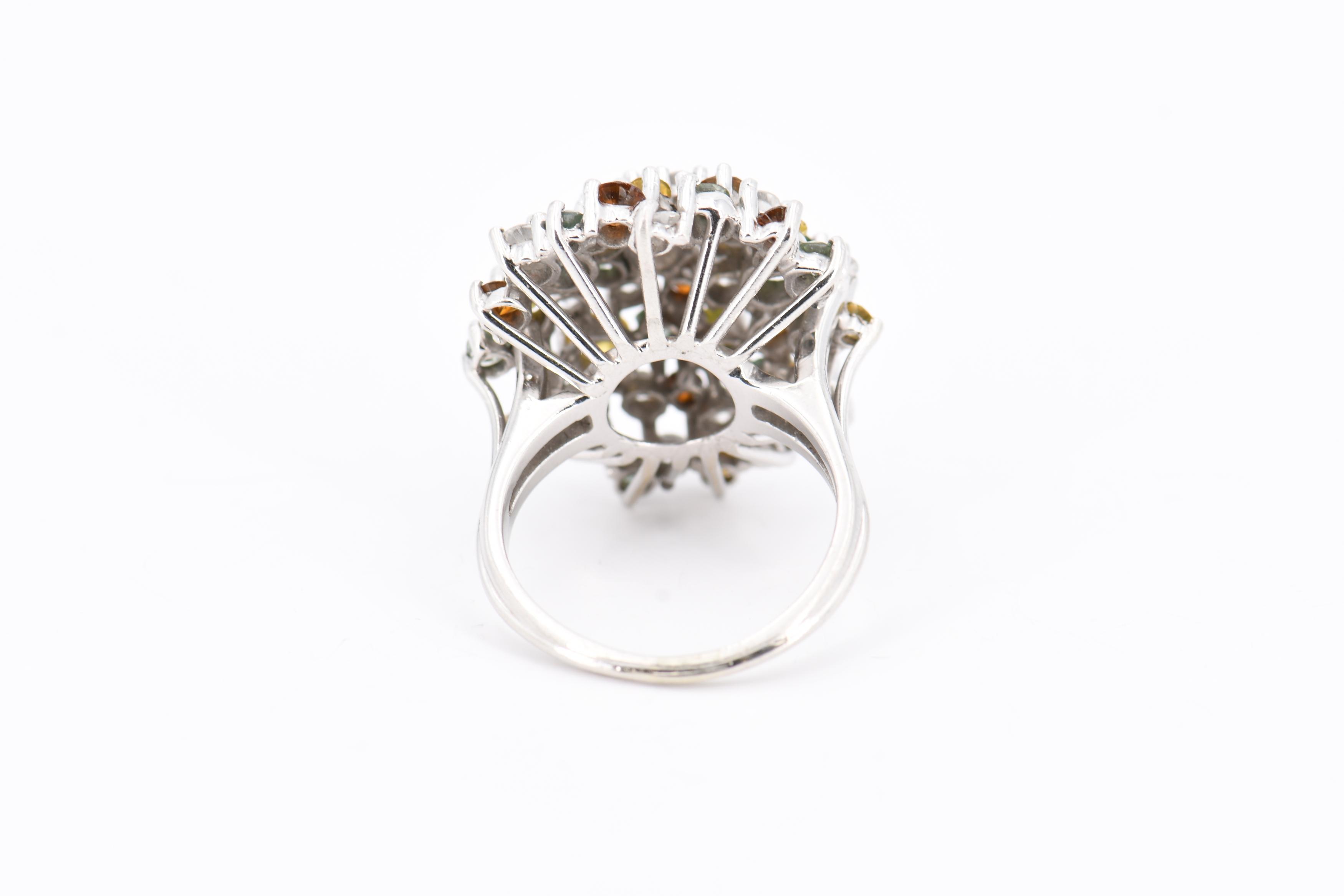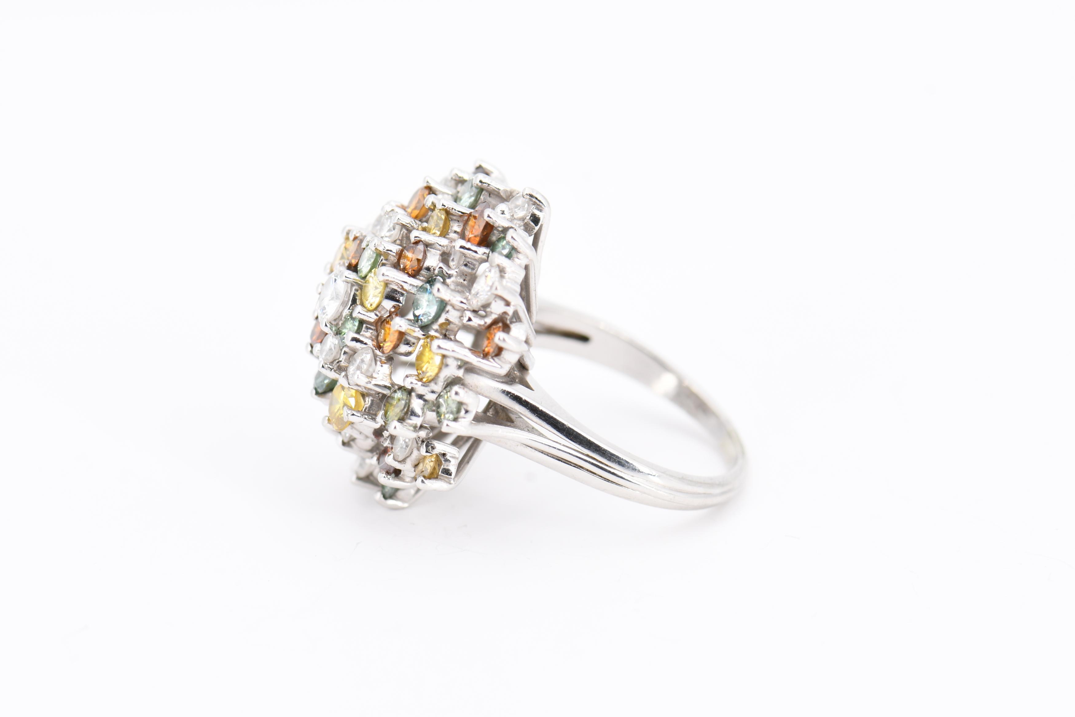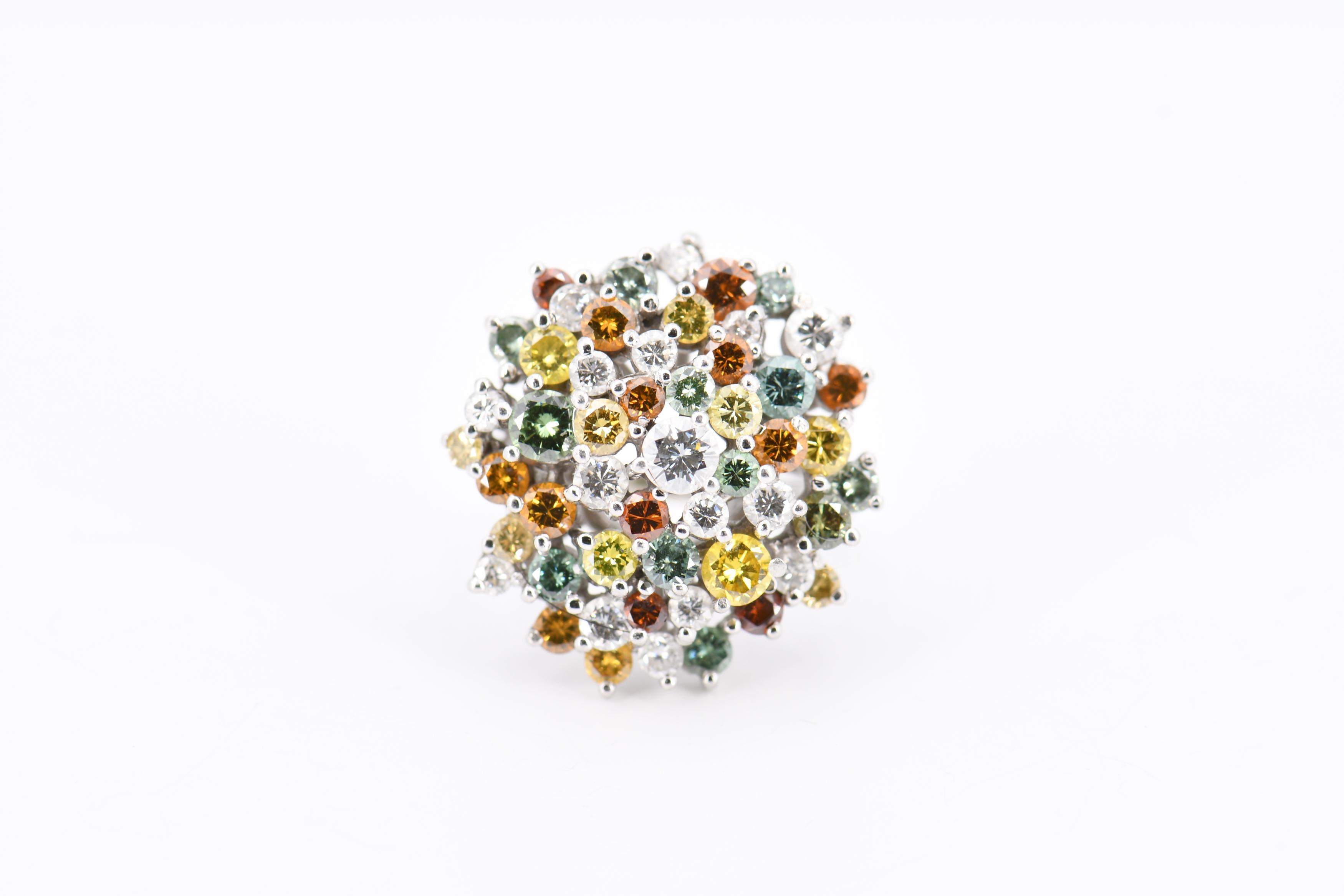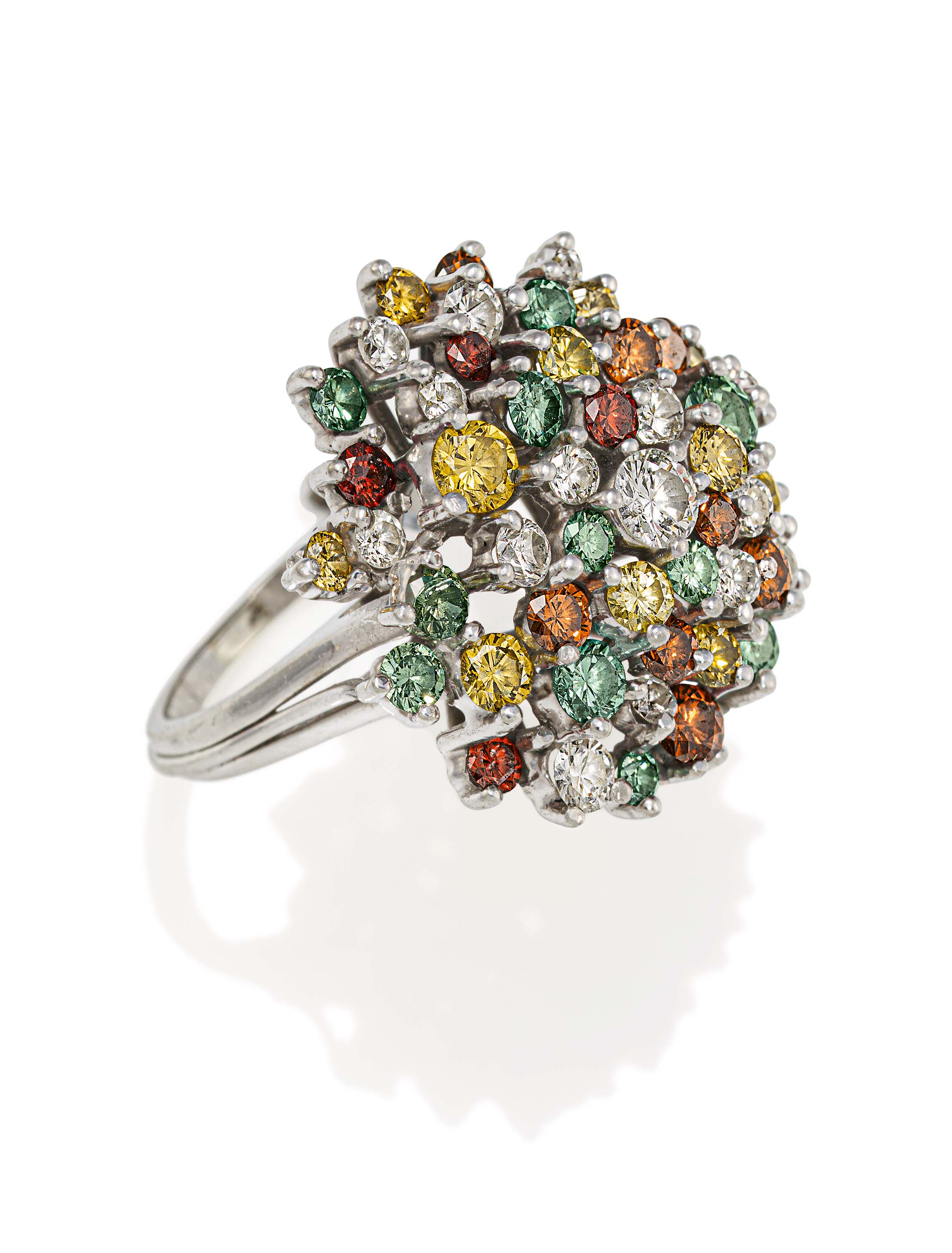 Diamanten: Ca. 55 Brillanten in verschiedenen, Gelb-, Orange-, Rot-, Braun- und Grüntönen, bestrahlt, zus. ca. 2,7 ct., VS-SI.