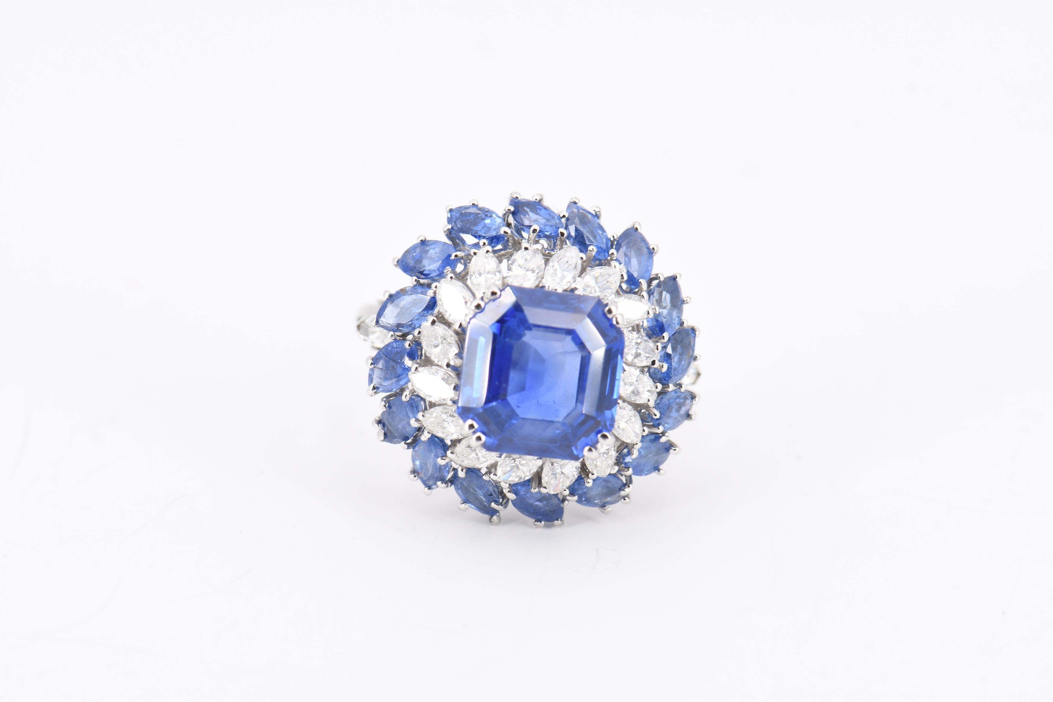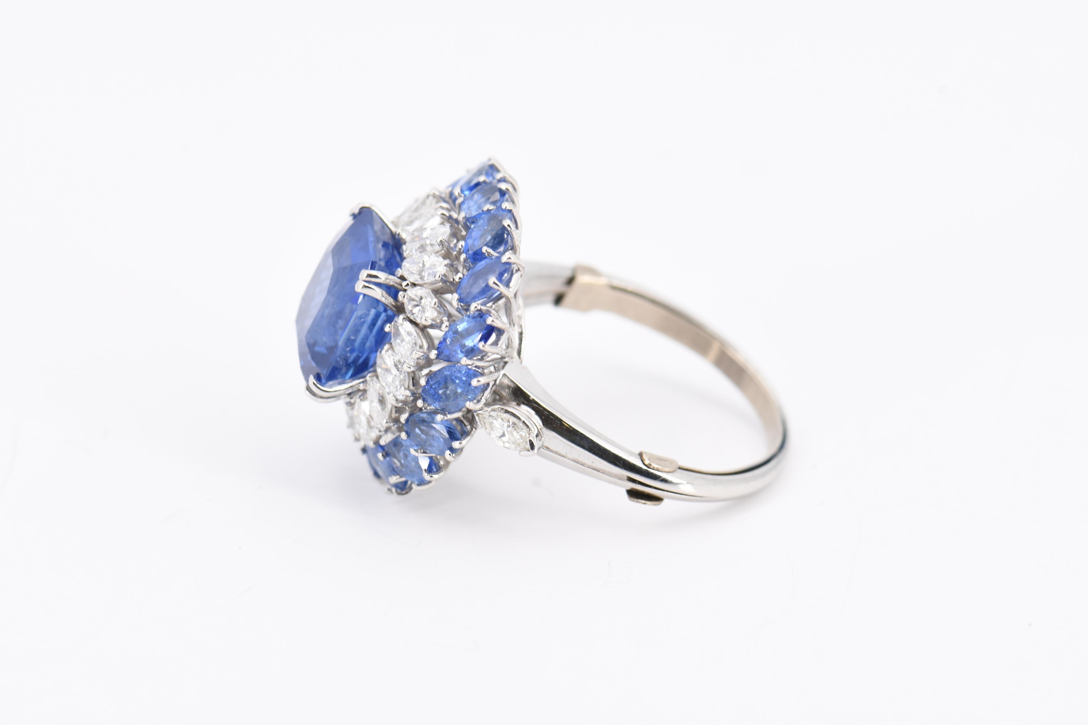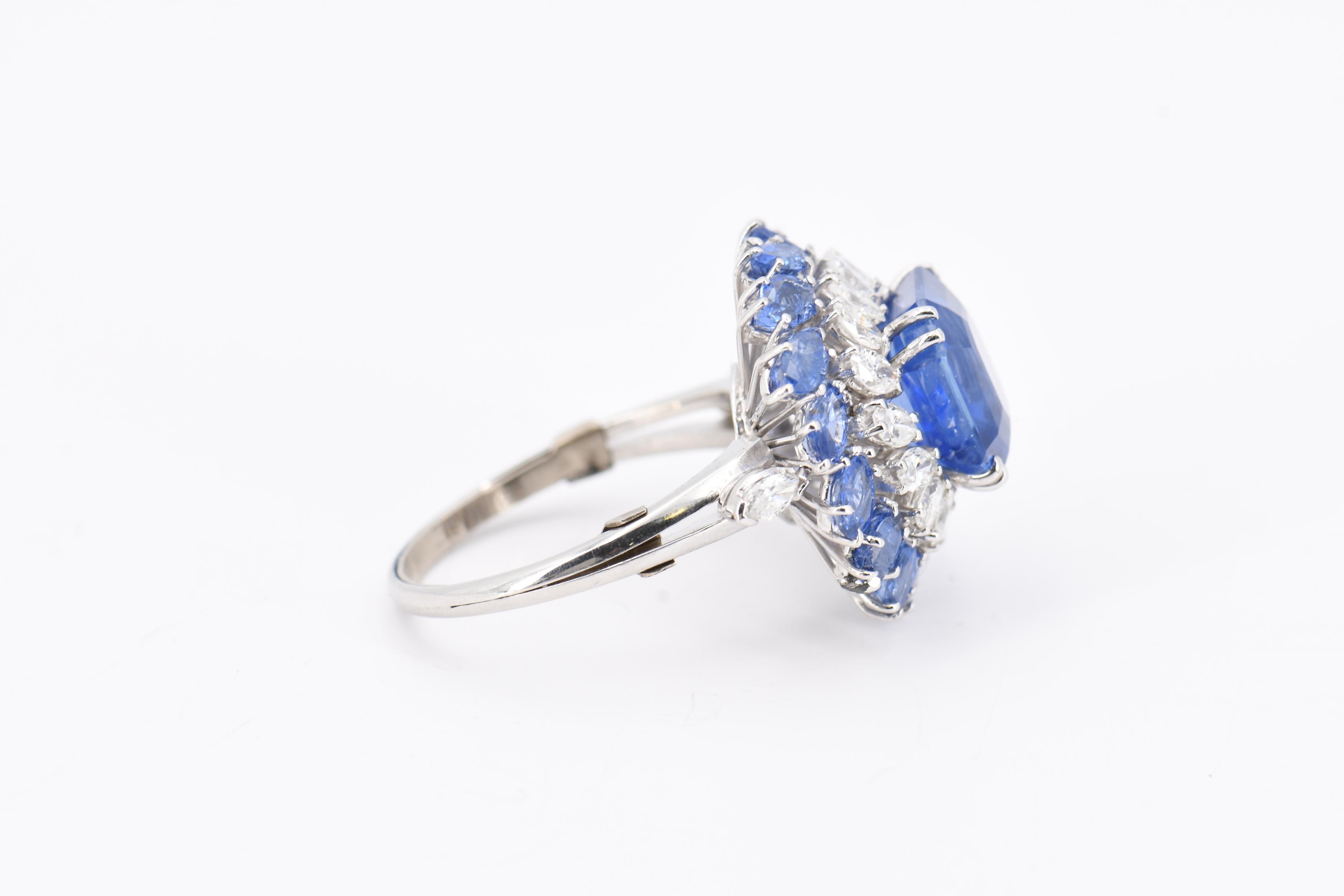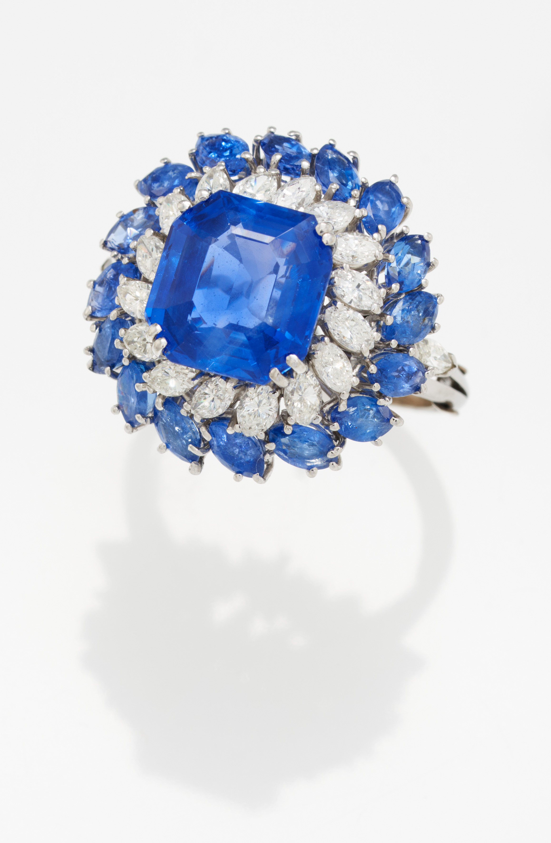 Edelsteine: 1 Saphir im Emerald-Schliff ca. 6,2 ct., wohl Ceylon, wohl unerhitzt, 16 Saphir-Navetten zus. ca. 2,0 ct.