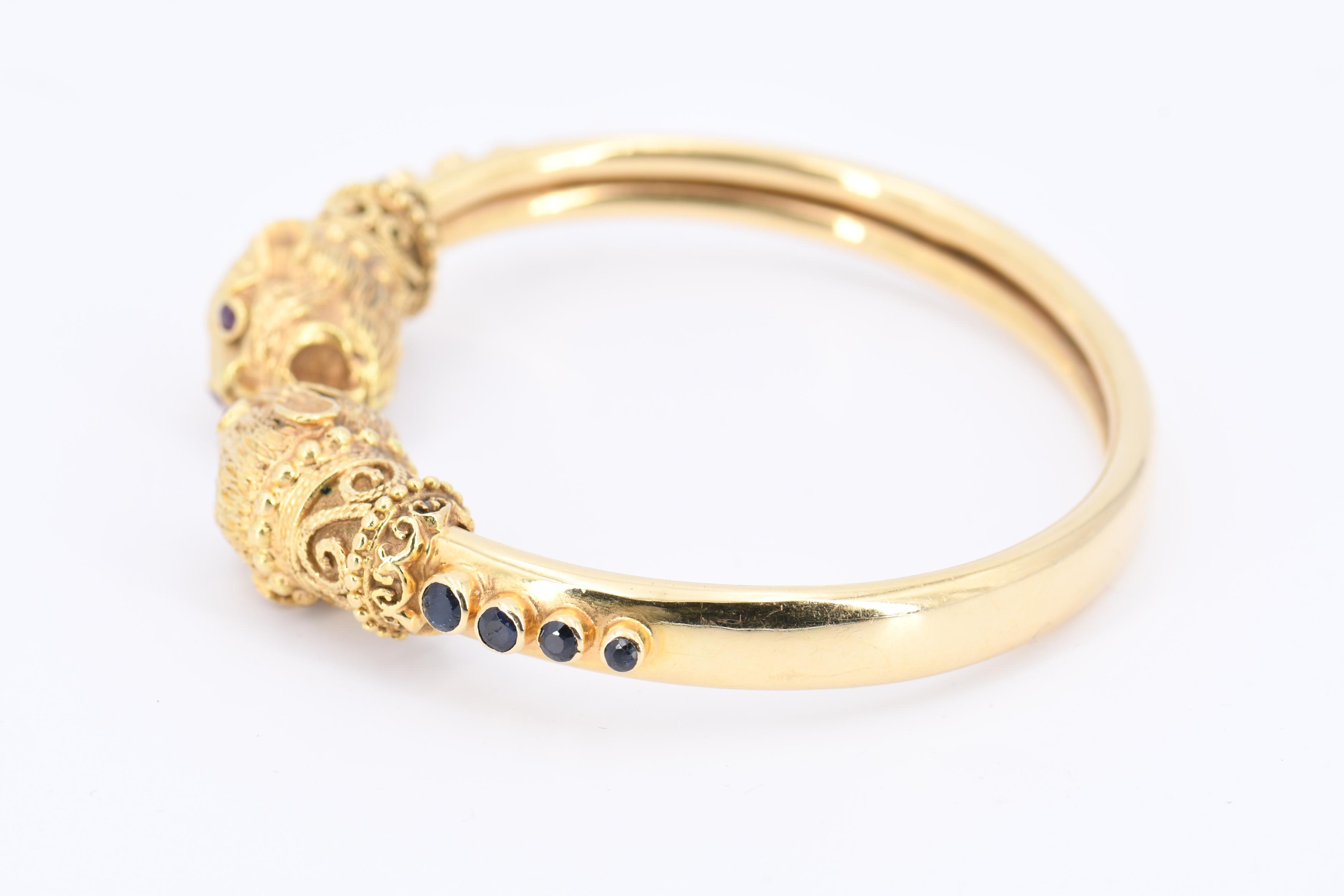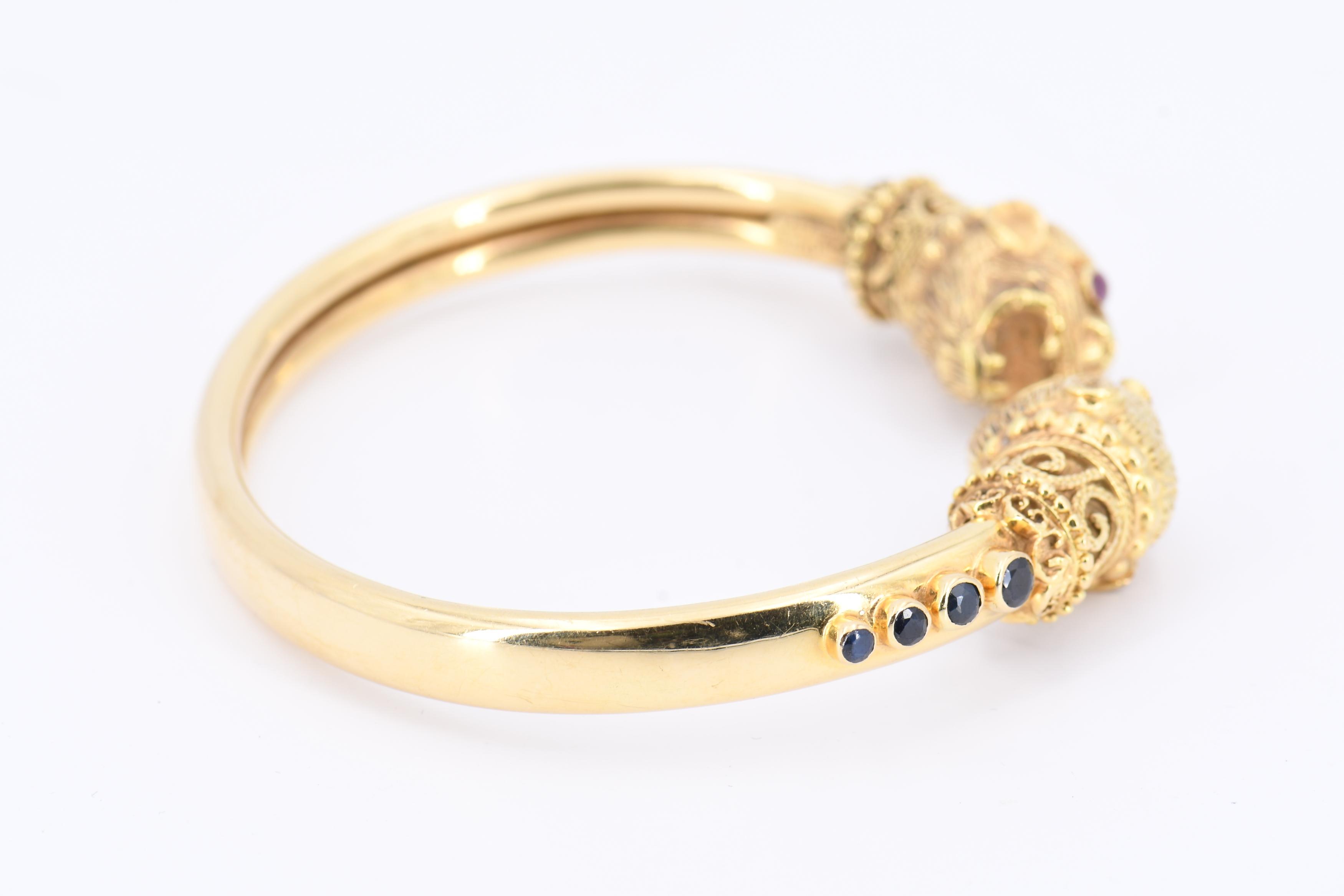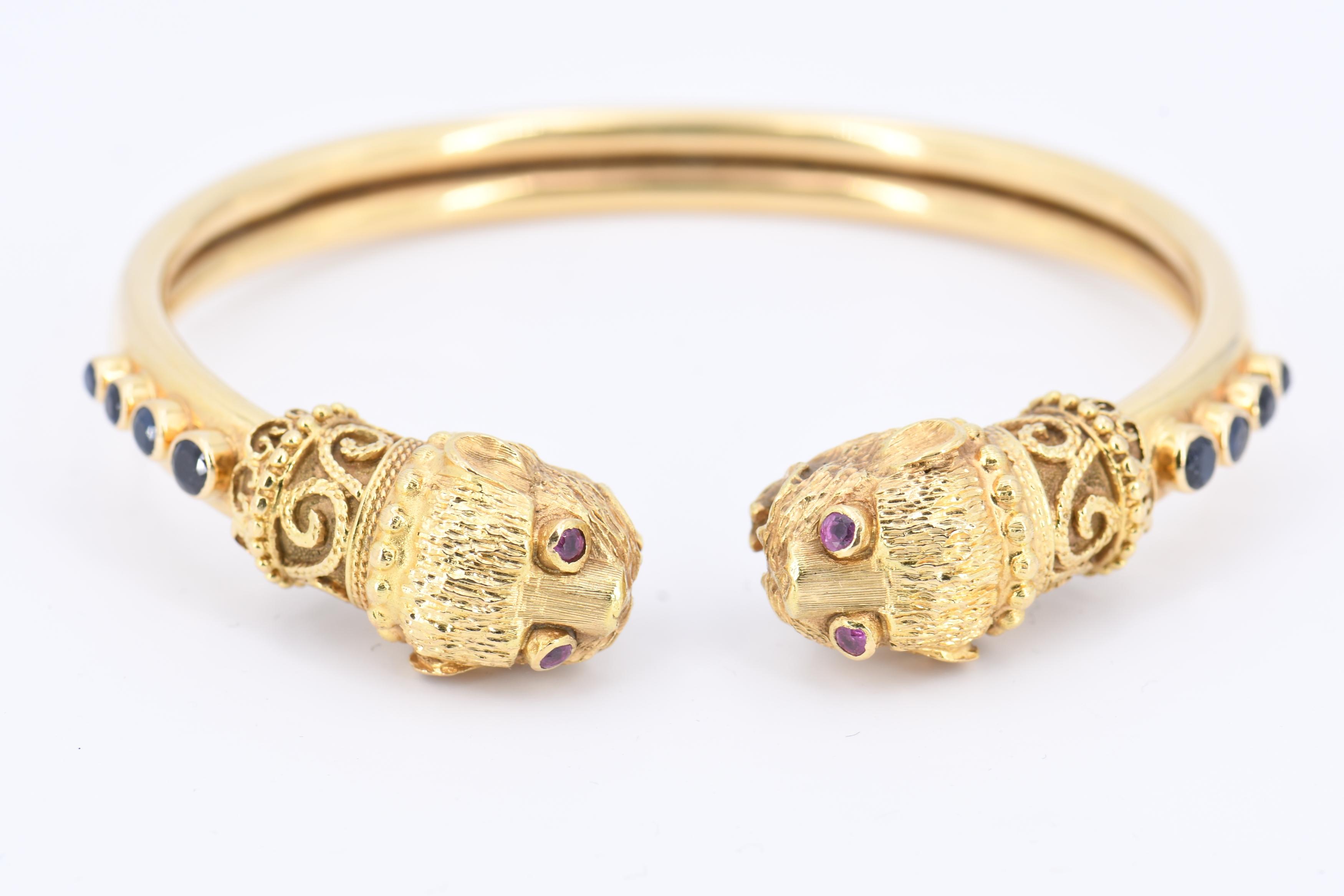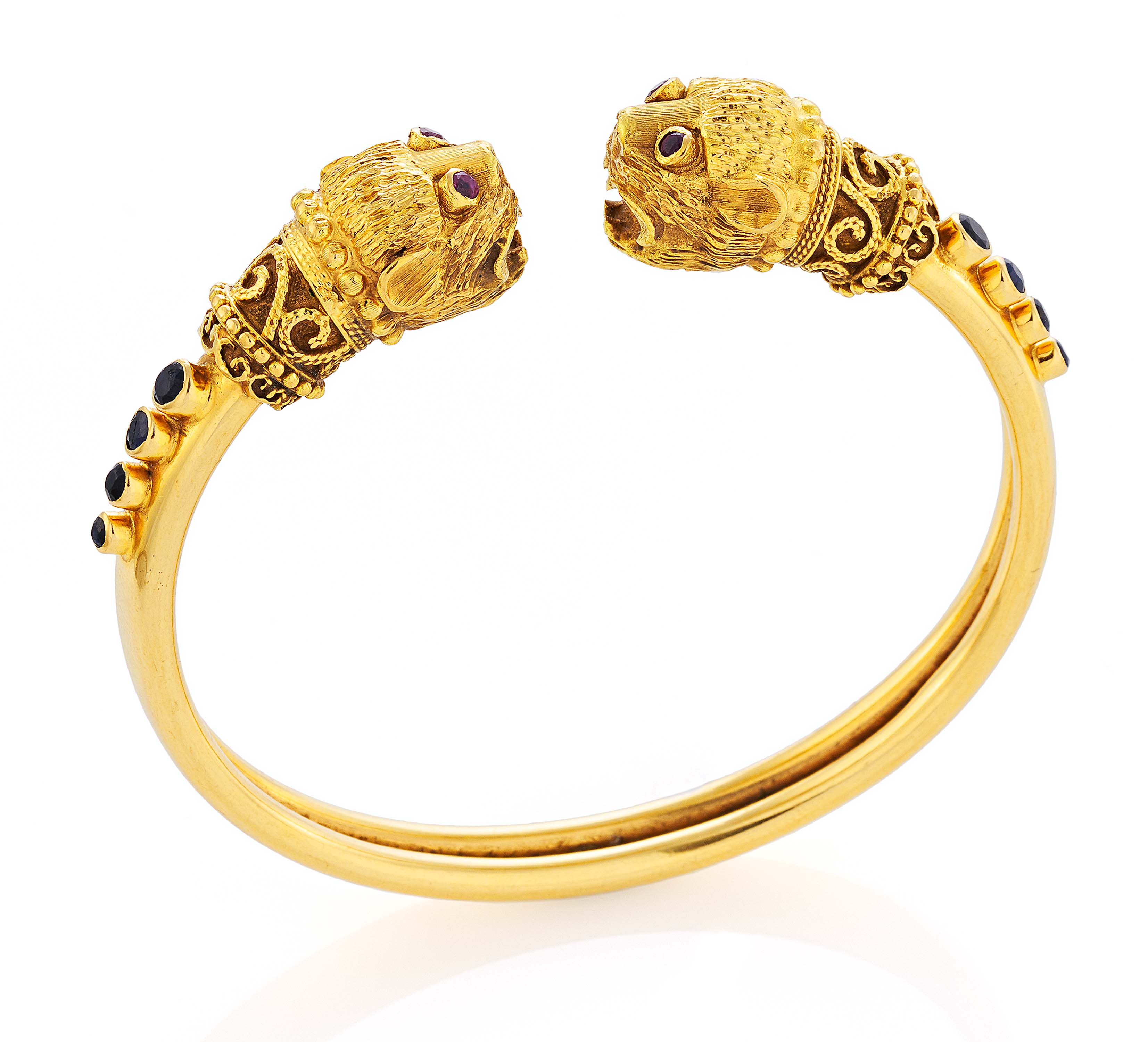 Edelsteine: 4 kleine rote Steine als Augen, 8 blaue Farbsteine, wohl Saphire zus. ca. 0,7 ct.