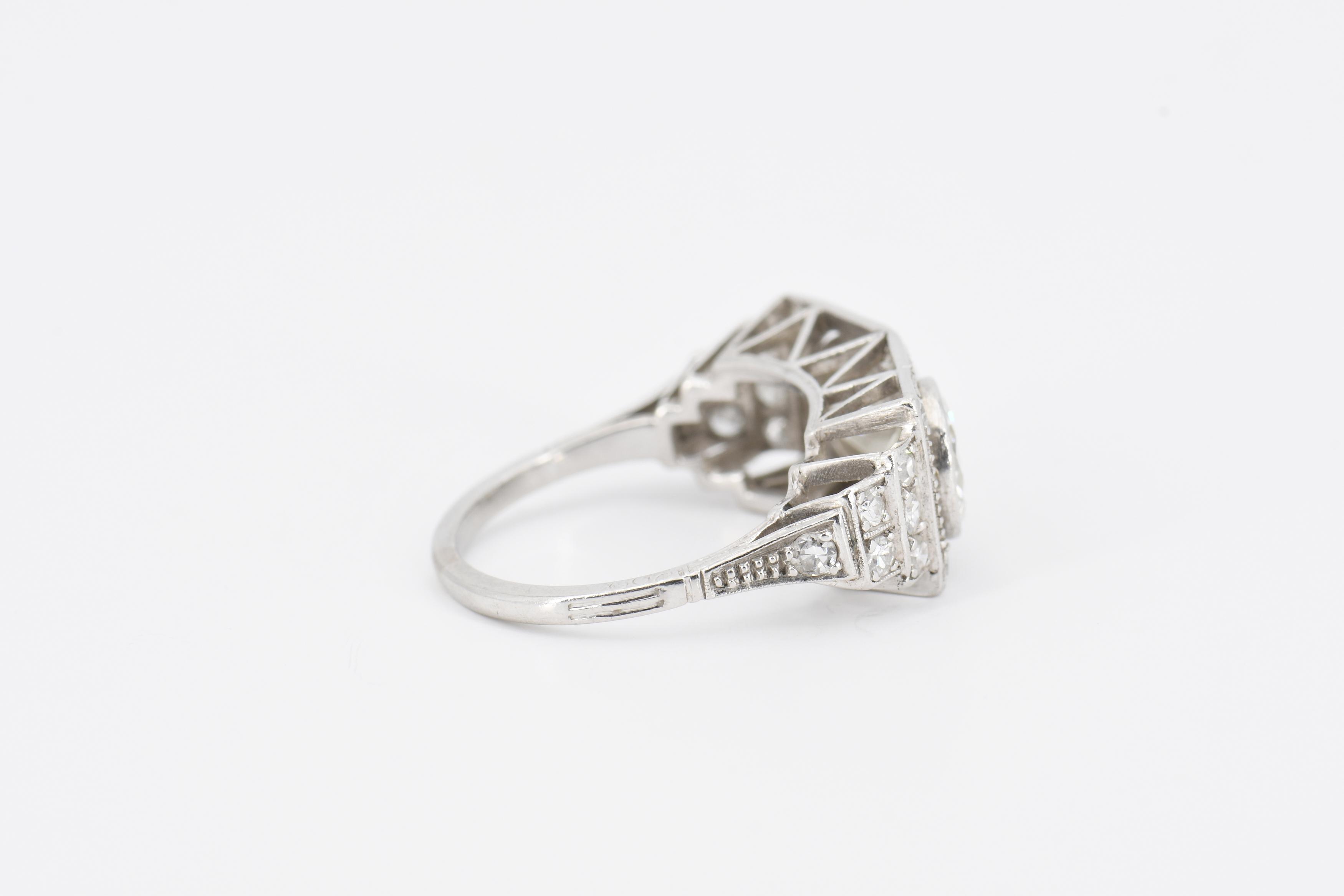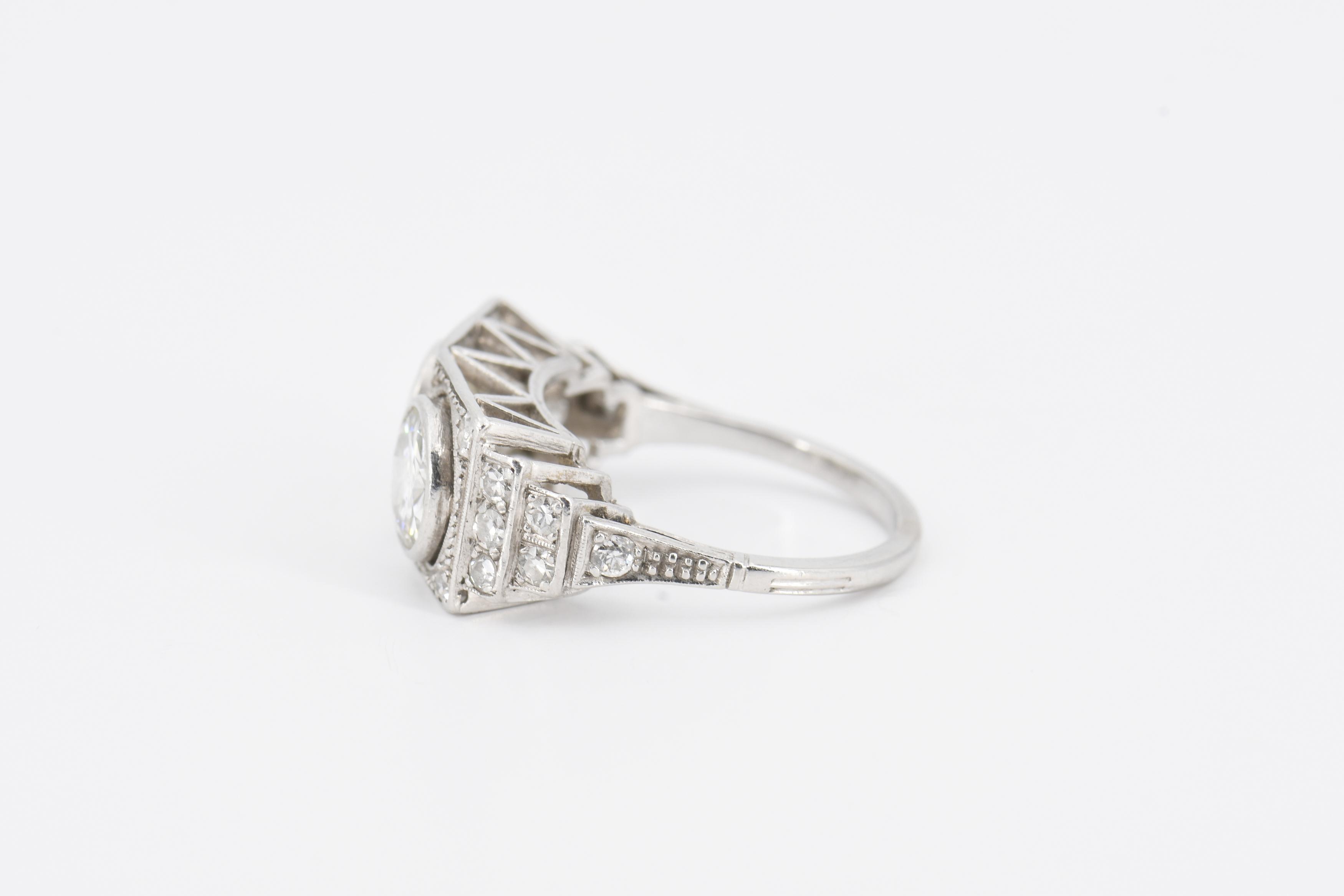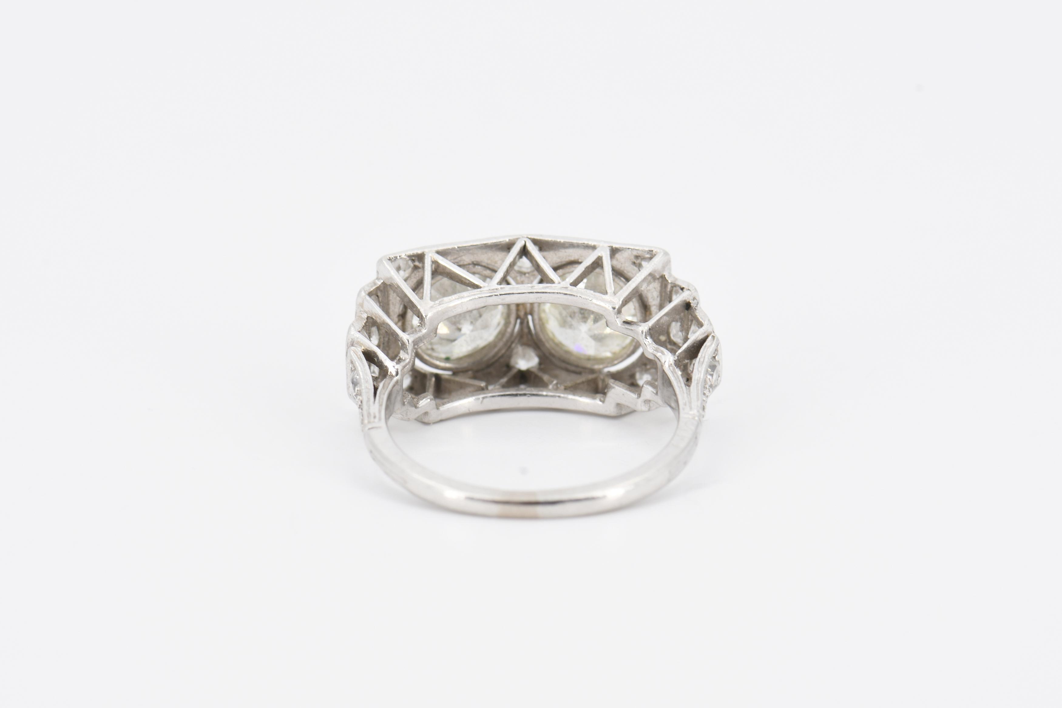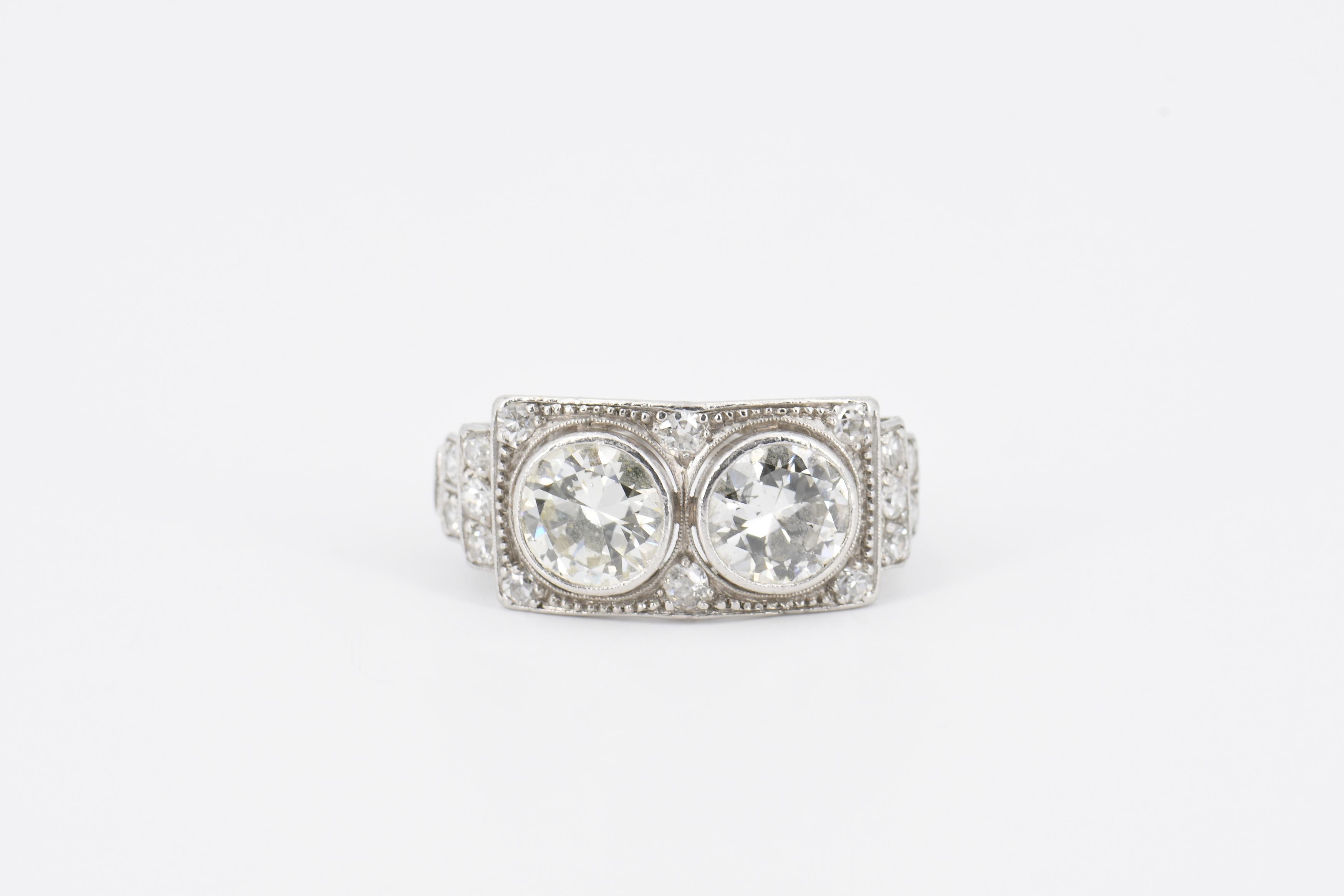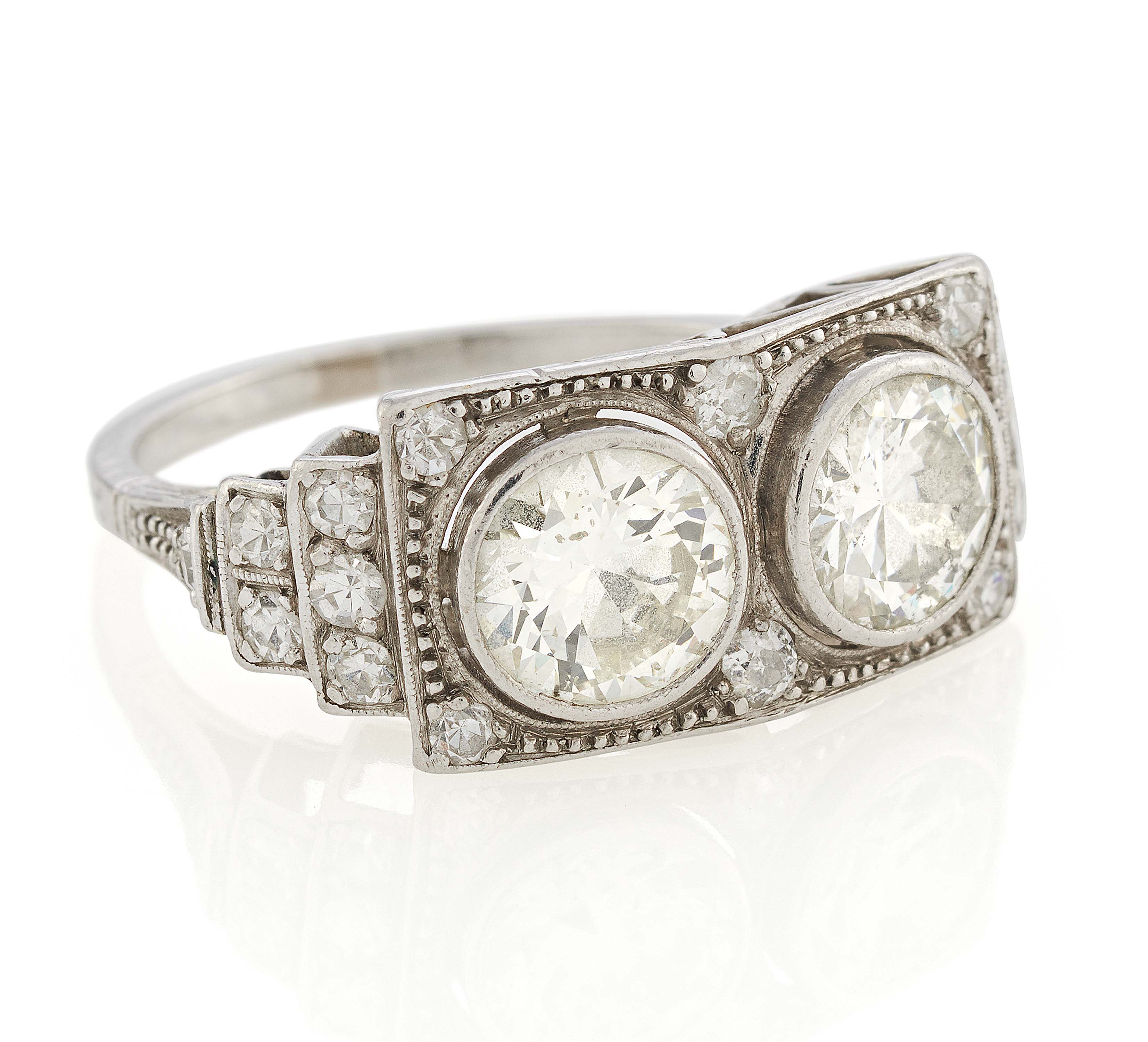 Diamanten: 2 Diamanten im Übergangs-Schliff zus. ca. 1,8 ct. P2/L-M, 18 kleine Diamanten im Übergangs-Schliff zus. ca. 0,4 ct.