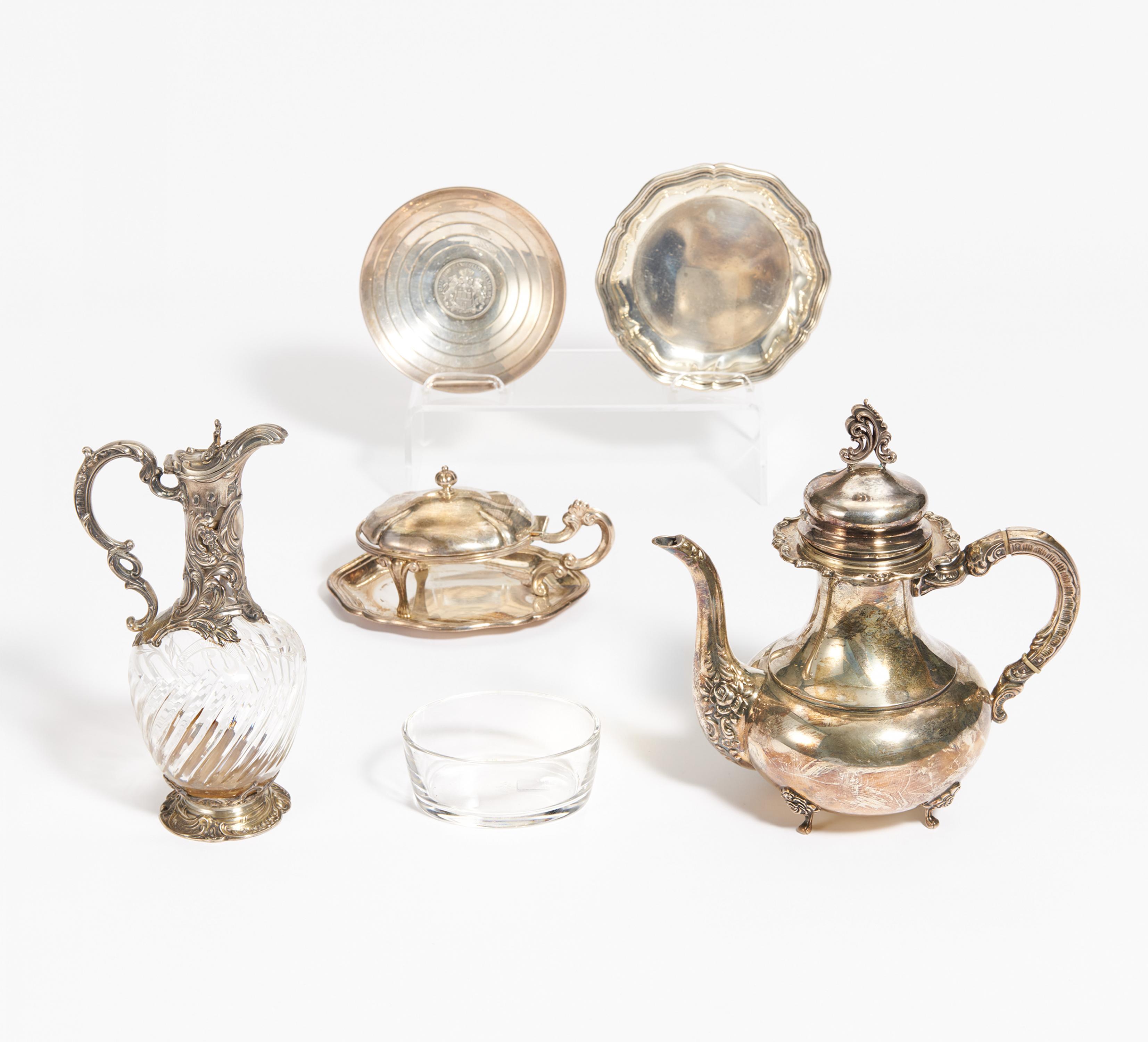 KONVOLUT KARAFFE, SCHALE, SILBERDOSE AUF UNTERSATZ, KAFFEEKANNE, MÜNZSCHALE.