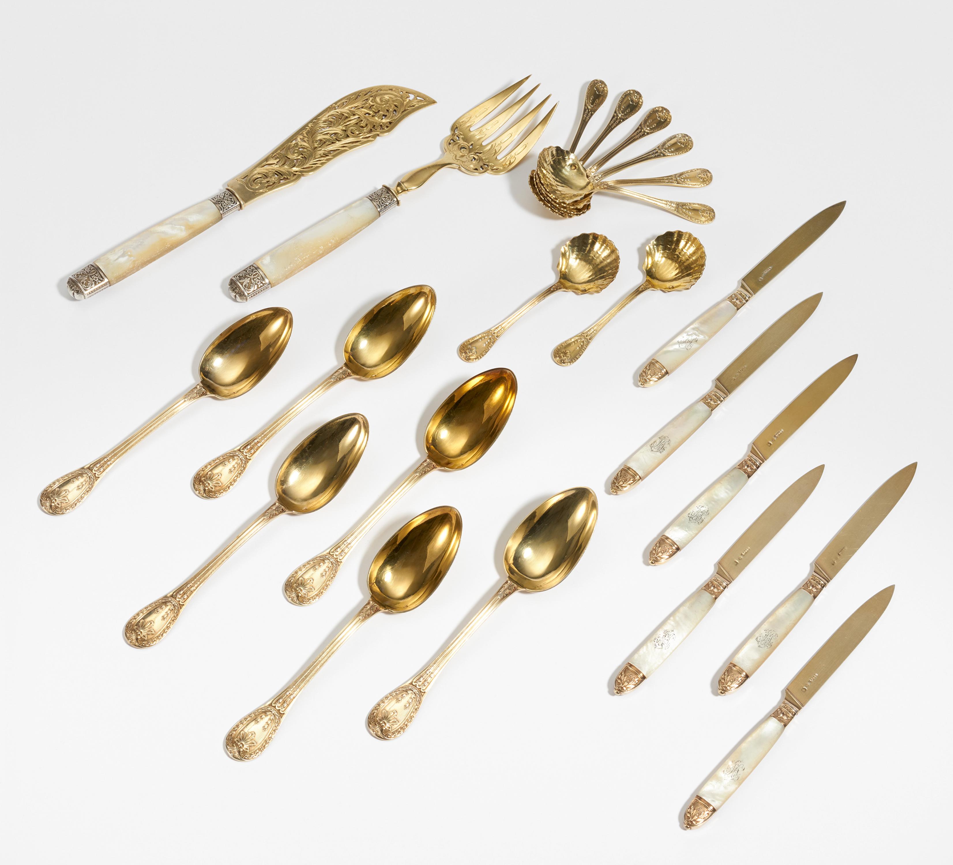 8 MUSCHELLÖFFEL, 6 SPEISELÖFFEL, 6 MESSER, VORLEGEBESTECK.
