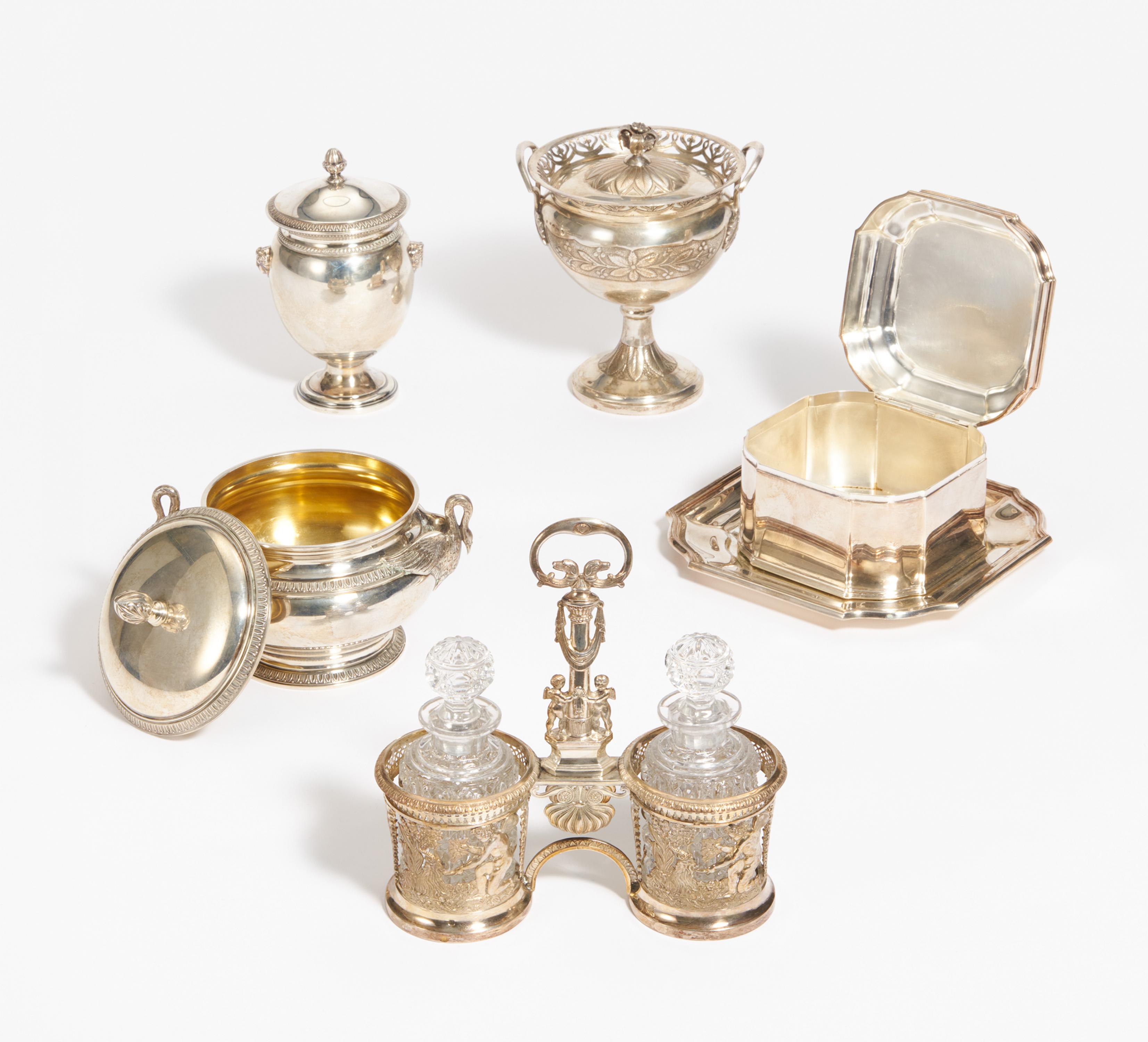 KONVOLUT SILBERDOSE AUF PRESENTOIR, ESSIG- UND ÖLMENAGE, 3 ZUCKERDOSEN VERSCHIEDEN.
