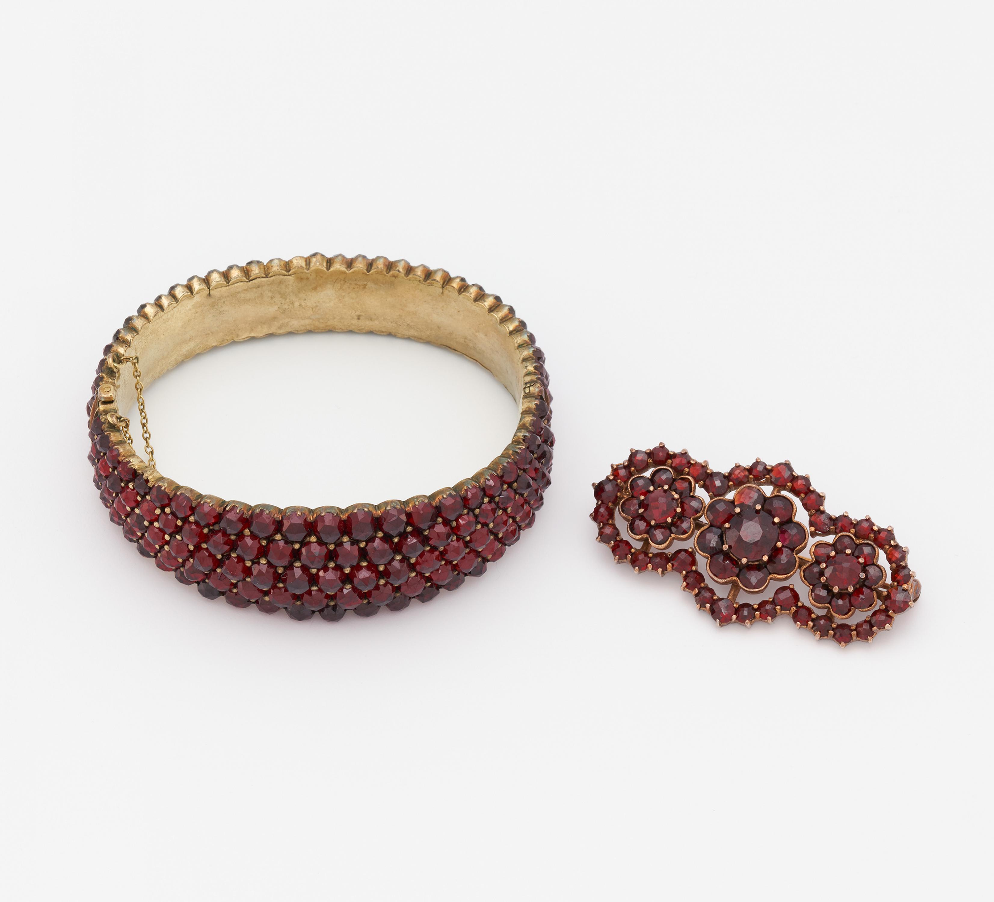 GRANAT-SET: BROSCHE UND ARMREIF.