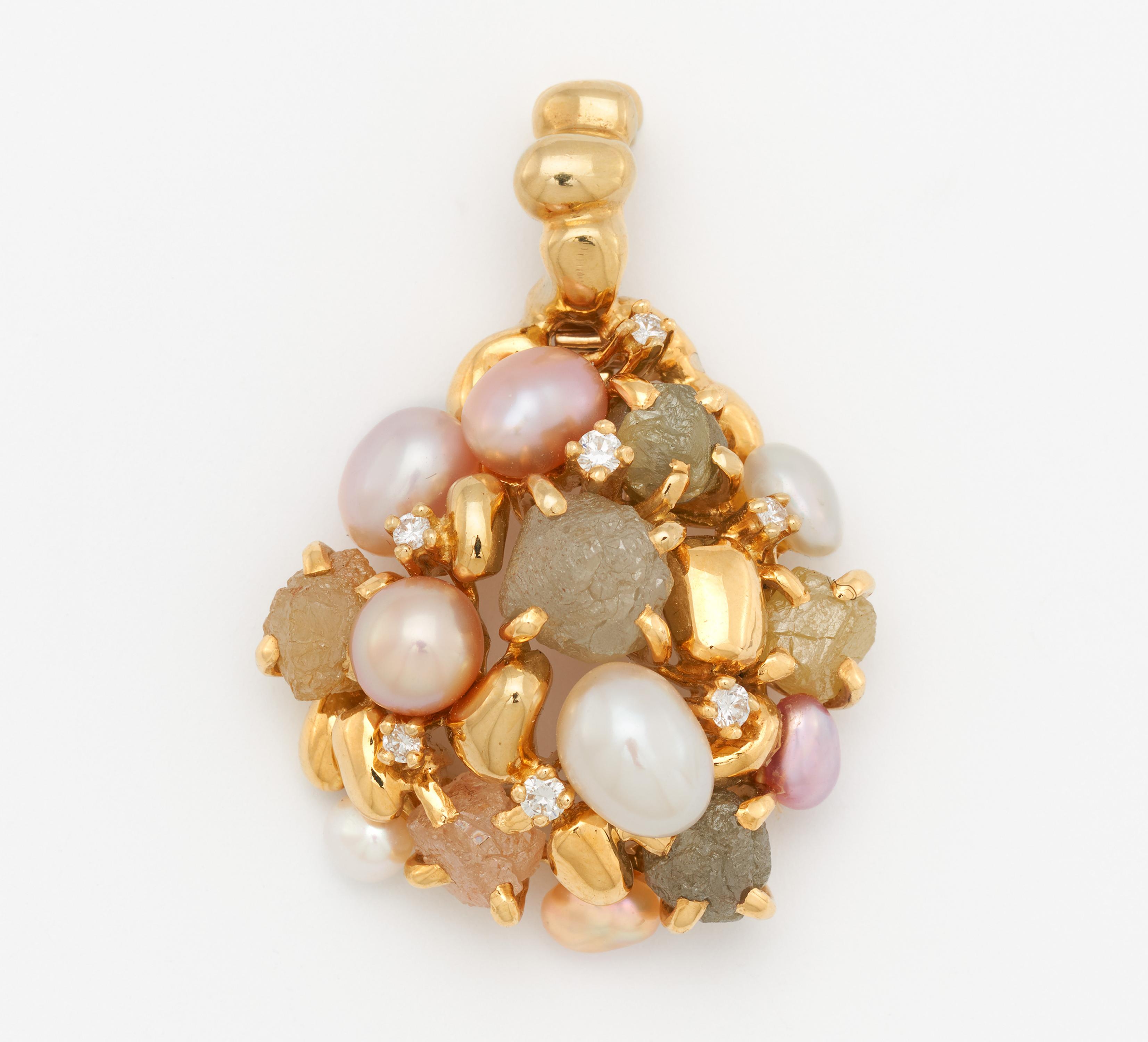 Diamanten: 7 kleine Brillanten Ø ca. 1,5 mm, 6 Diamanten ungeschliffen Ø ca. 6,4 - 8,3 mm, grünlich-grau.