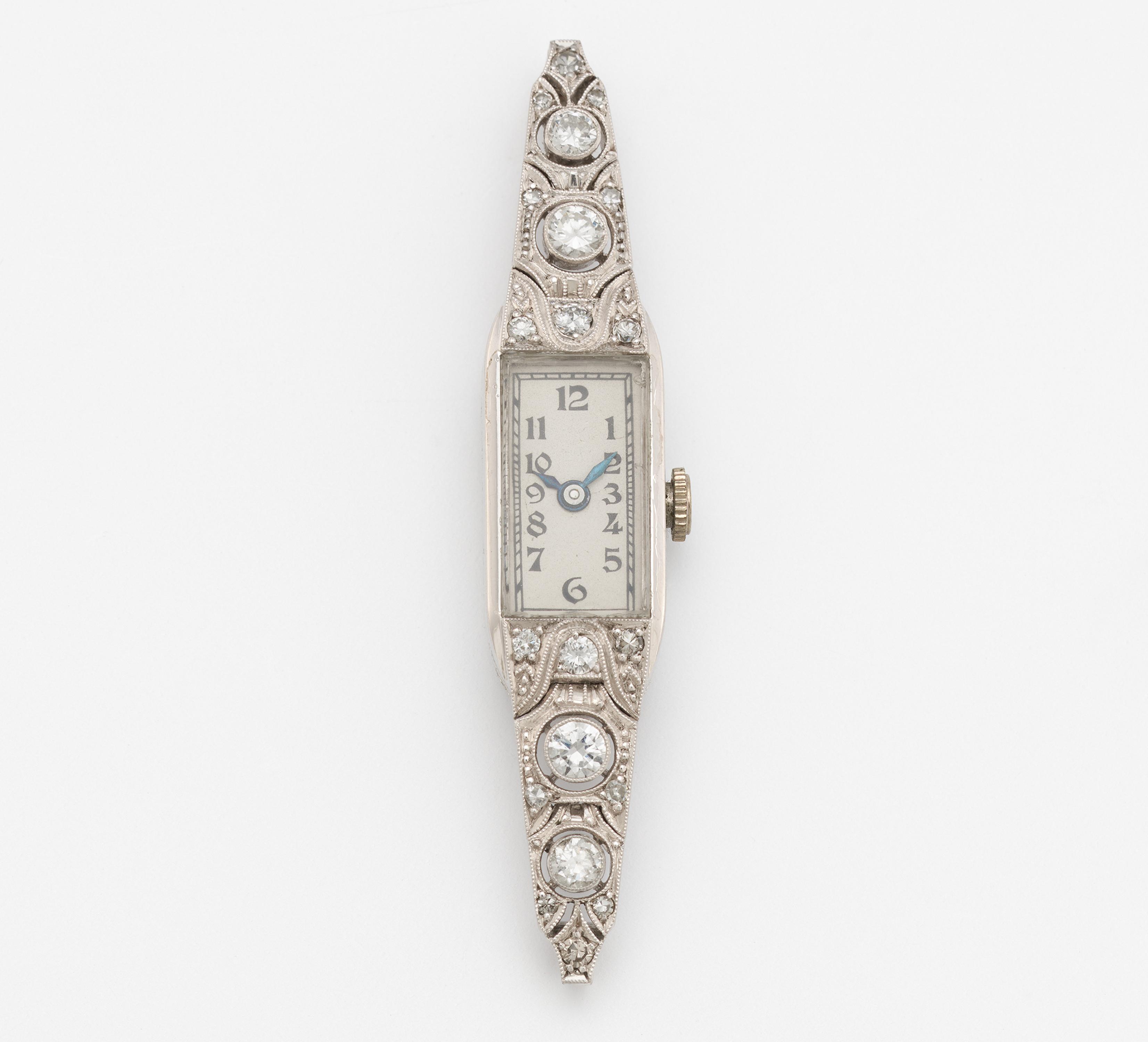 Gehäuse/Armband: Platin, getestet, Diamantgeziert, Zffbl. lackiert, bedruckt, Zeiger gebläut.