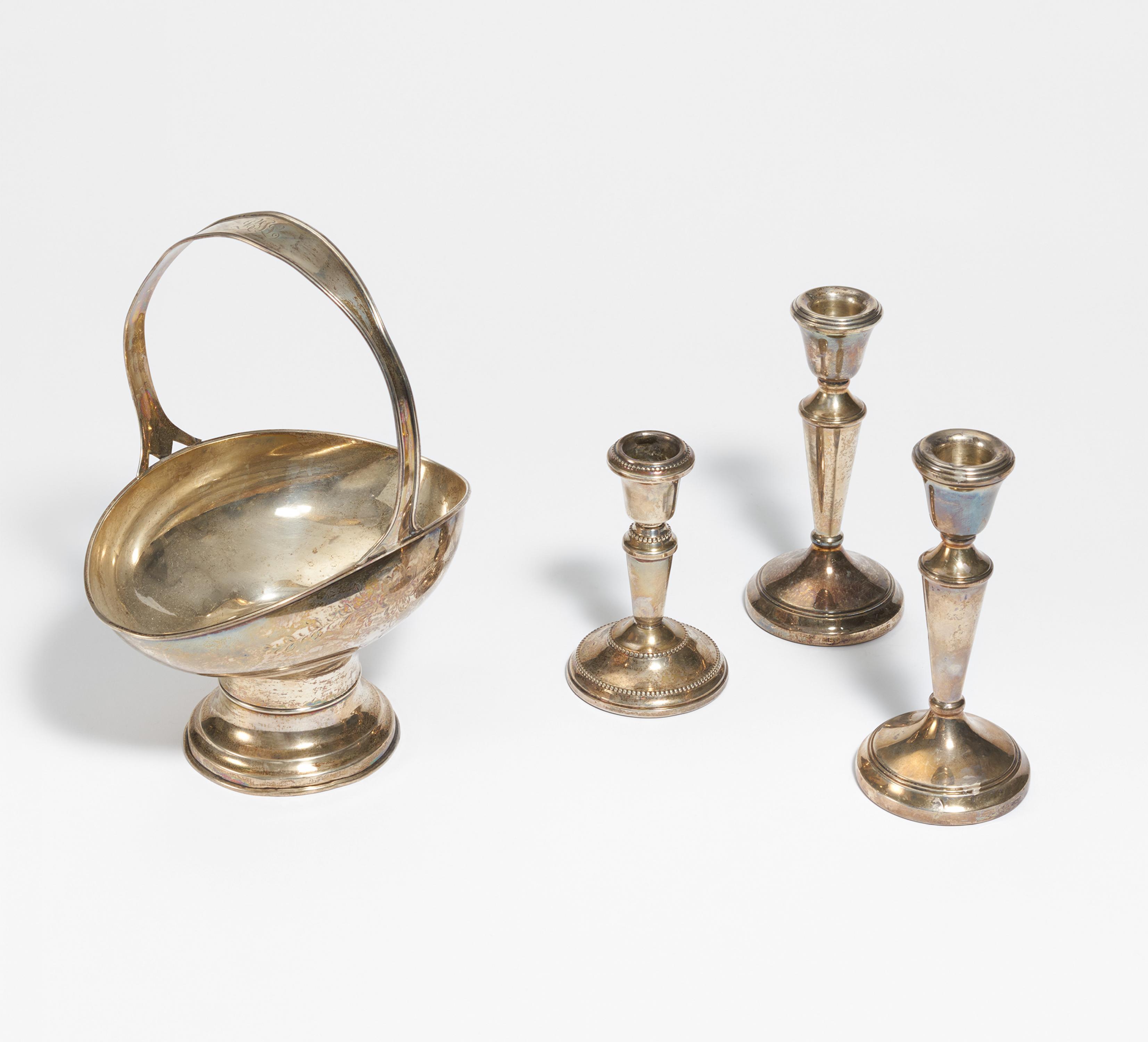 KONVOLUT 3 KLEINE KERZENLEUCHTER, EINE KONFEKTSCHALE.
