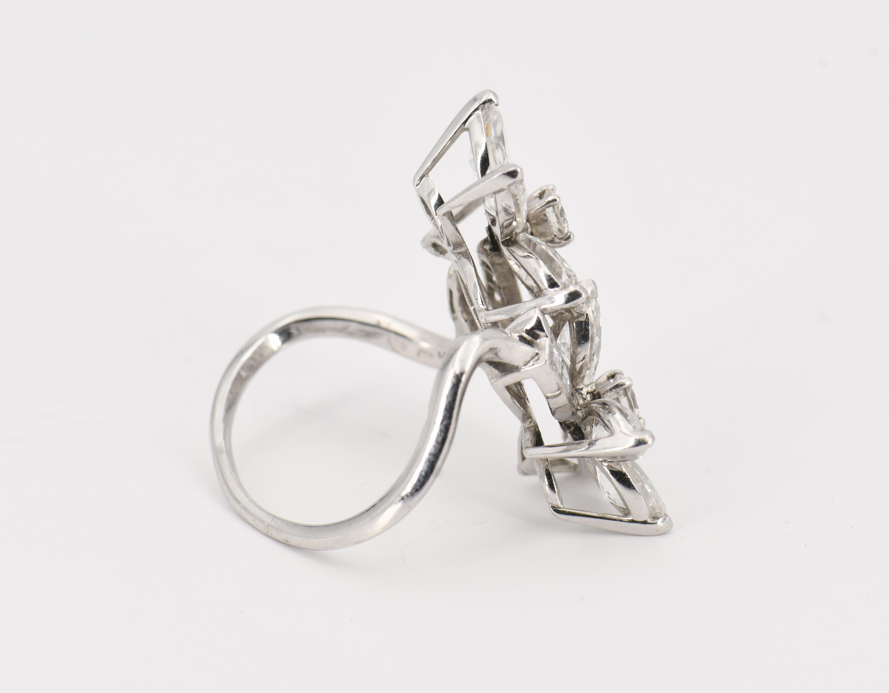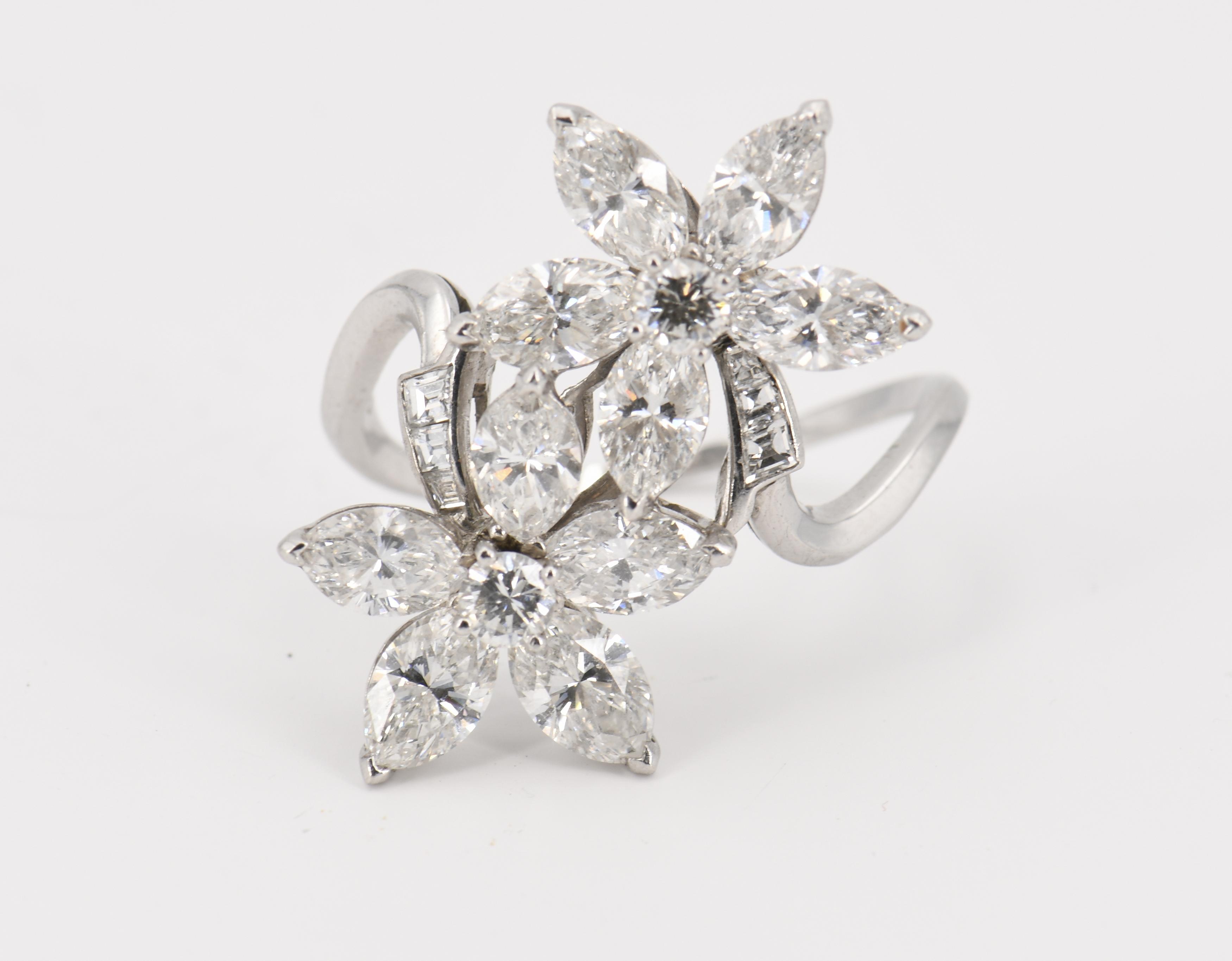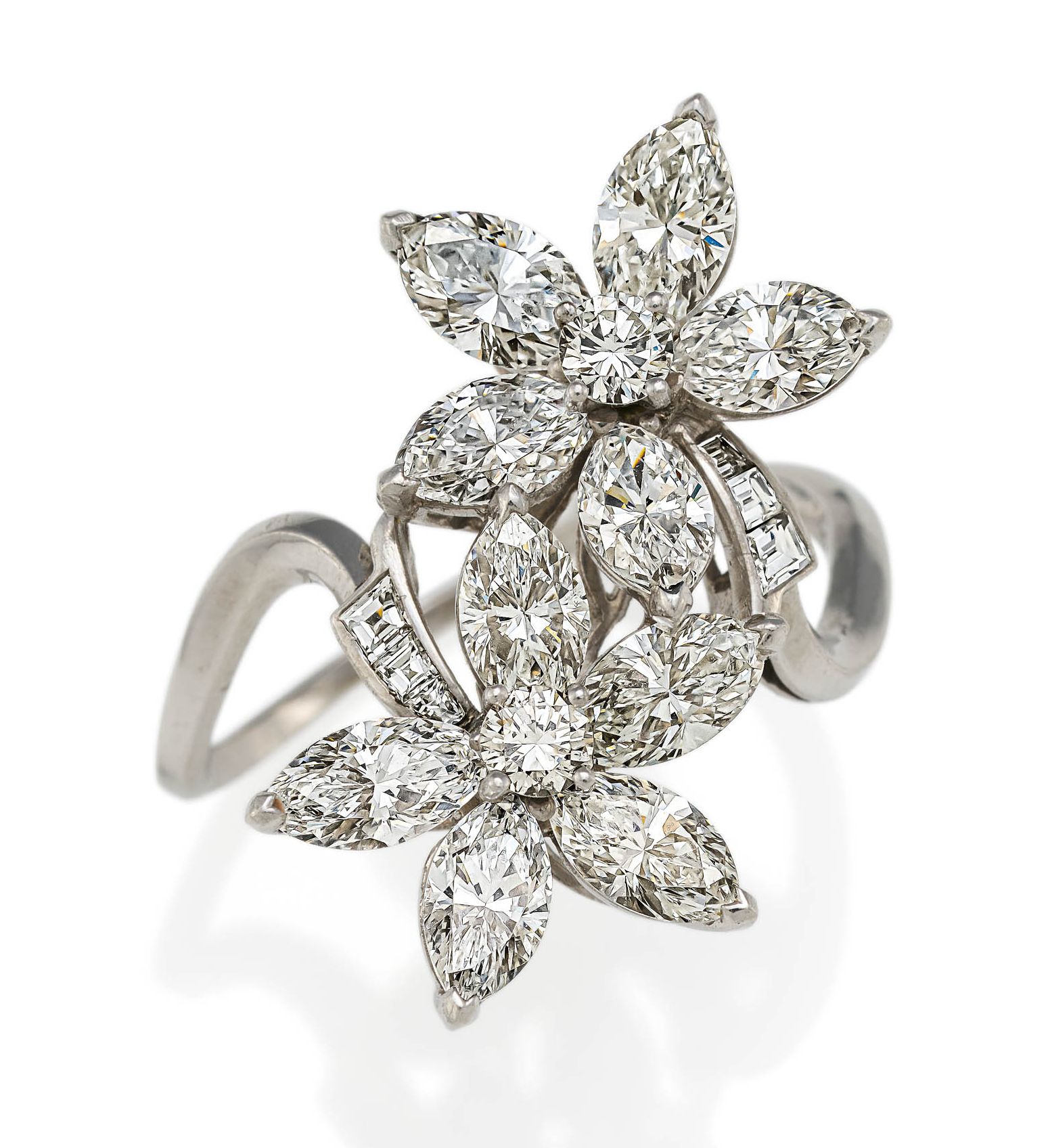 Diamanten: 10 Diamanten im Navette-Schliff zus. ca. 4,3 ct. G-I/VVS, 2 Brillanten und 6 Diamanten im Trapez-Schliff zus. ca. 0,55 ct.