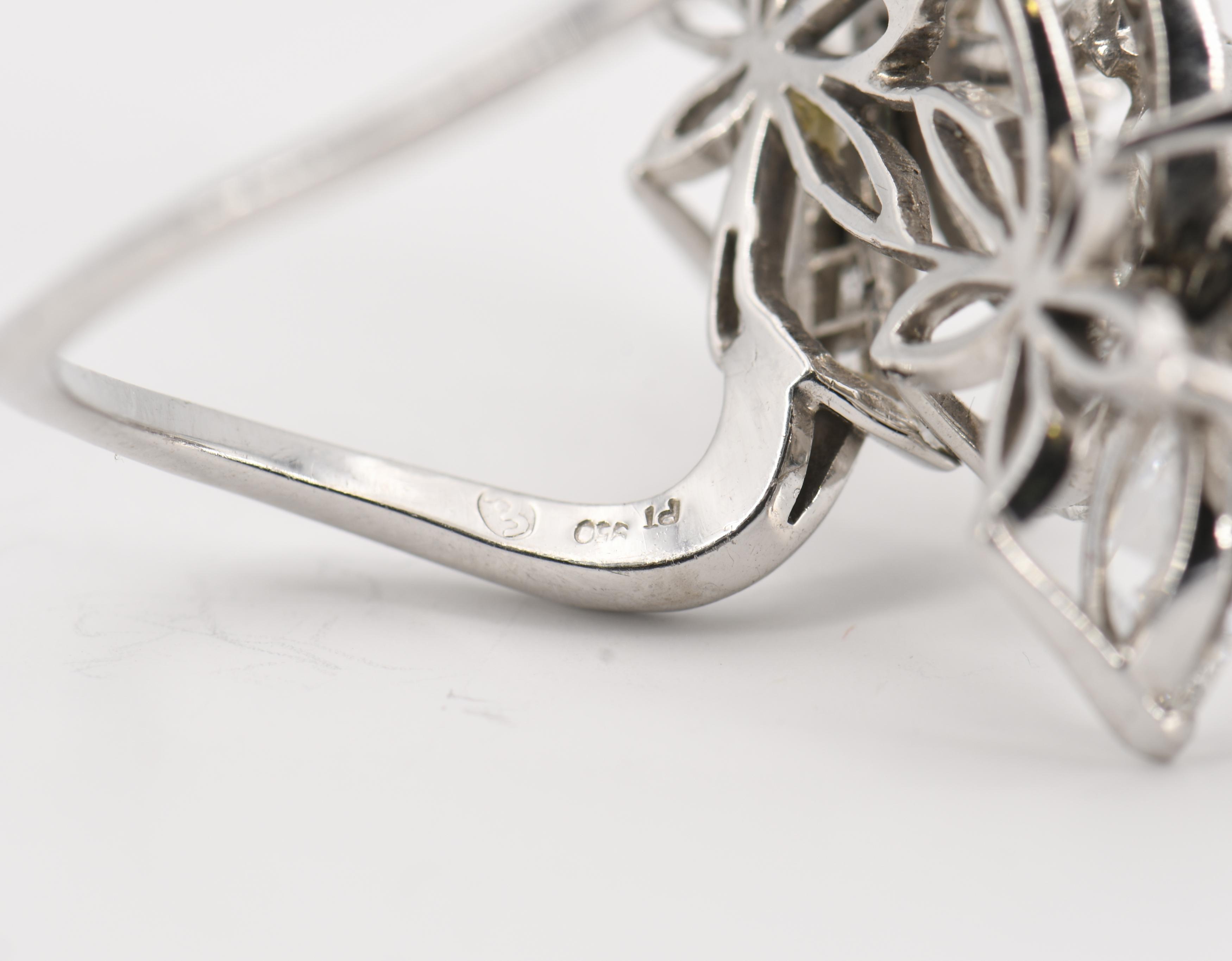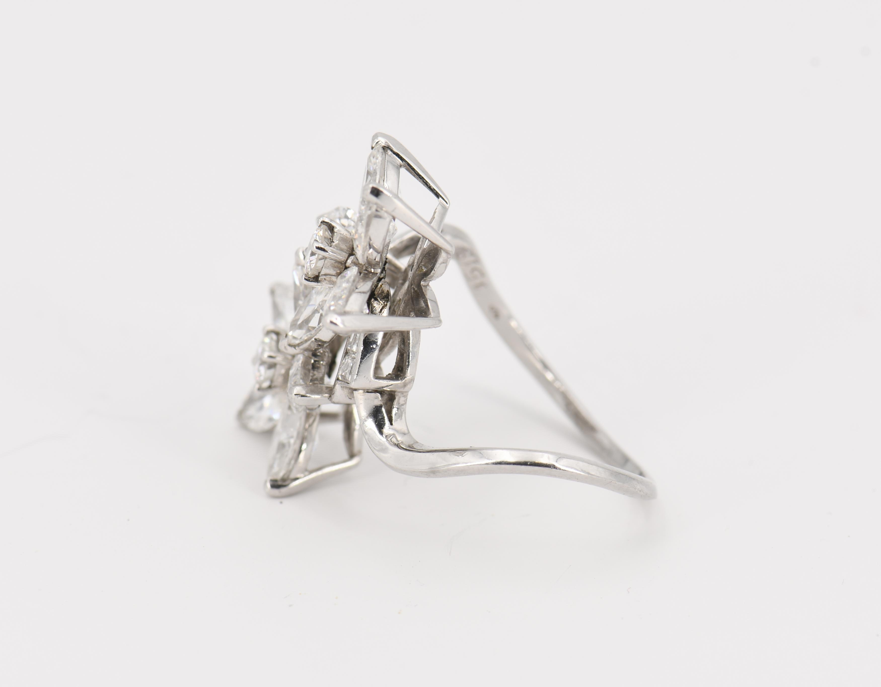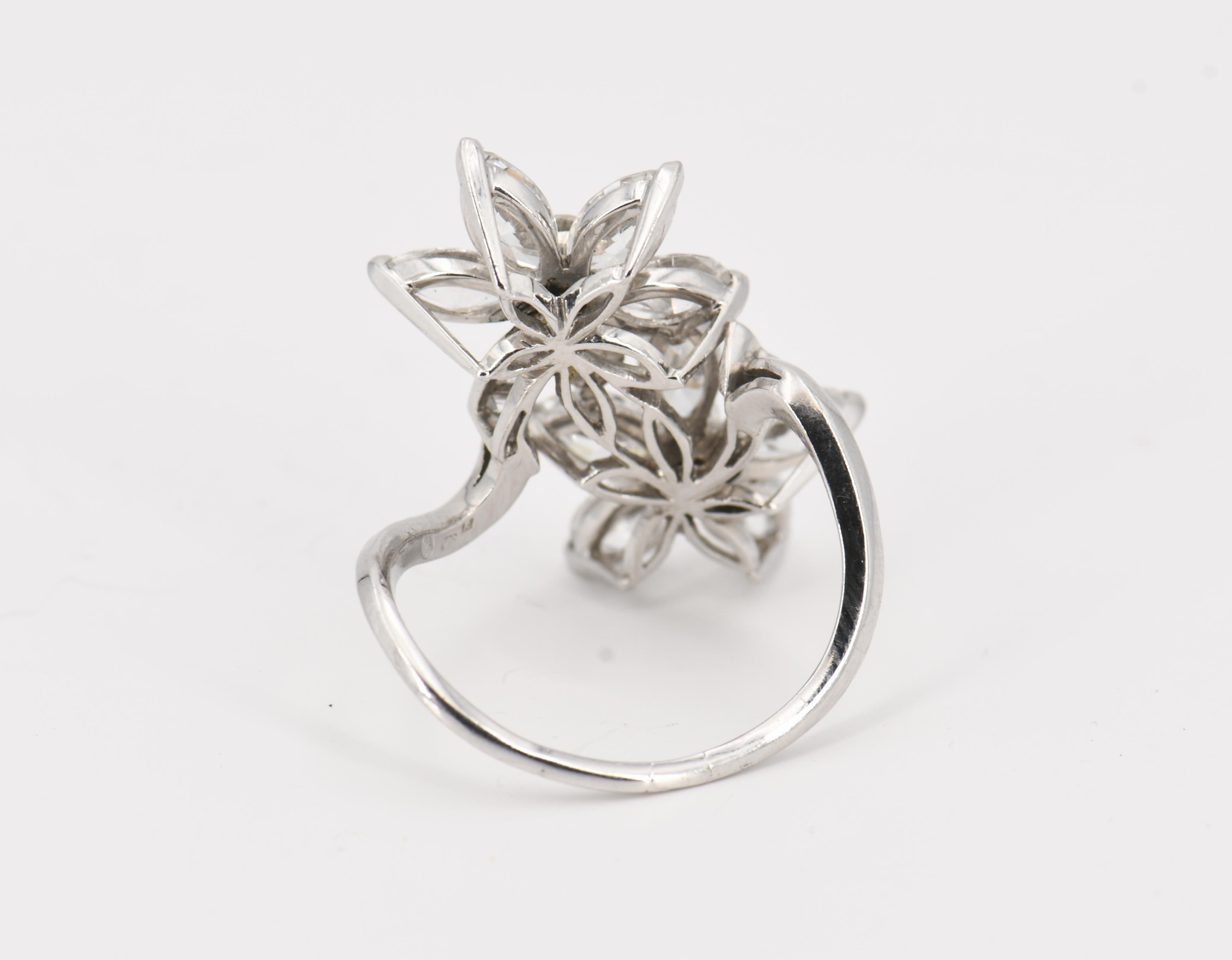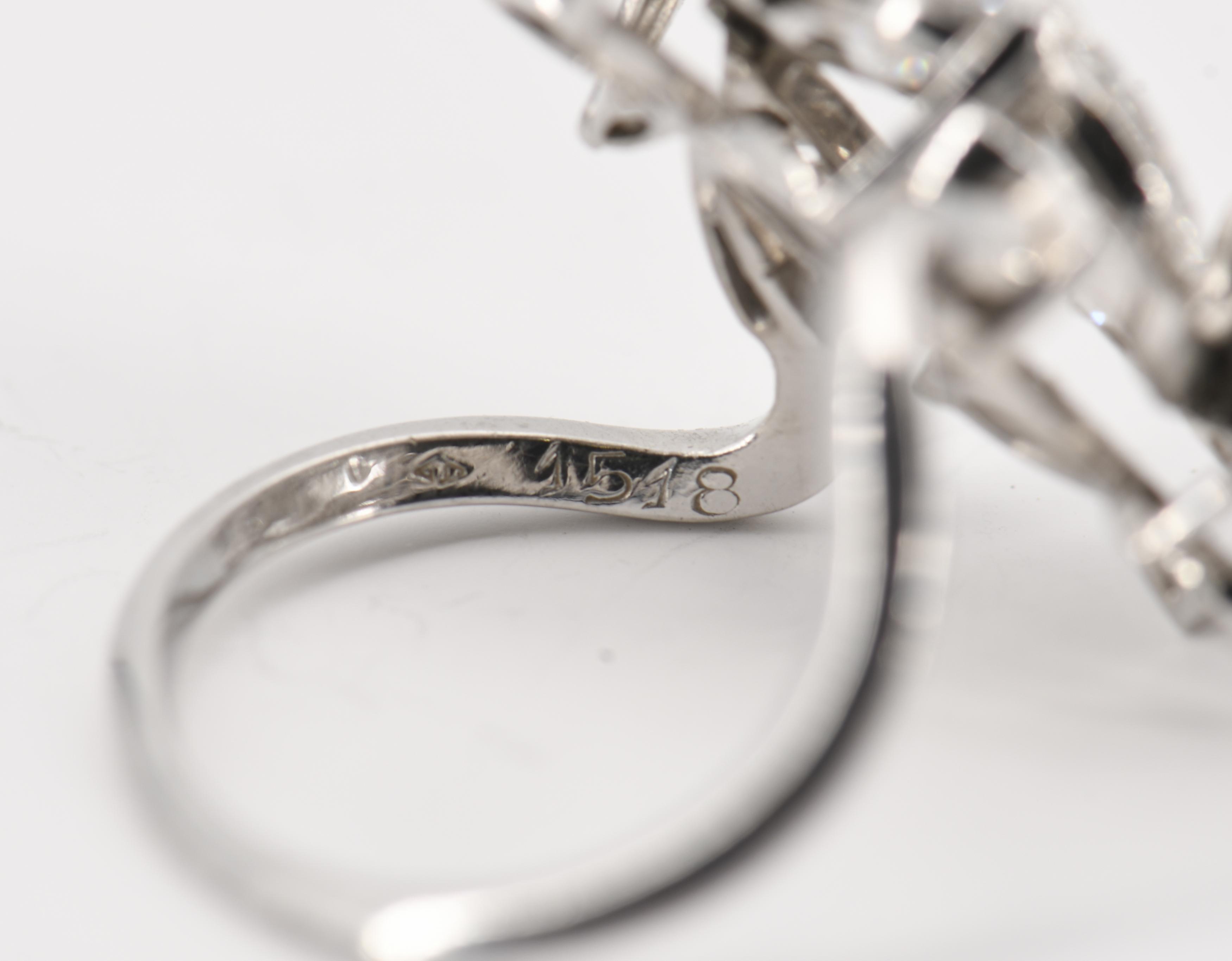 Diamanten: 10 Diamanten im Navette-Schliff zus. ca. 4,3 ct. G-I/VVS, 2 Brillanten und 6 Diamanten im Trapez-Schliff zus. ca. 0,55 ct.