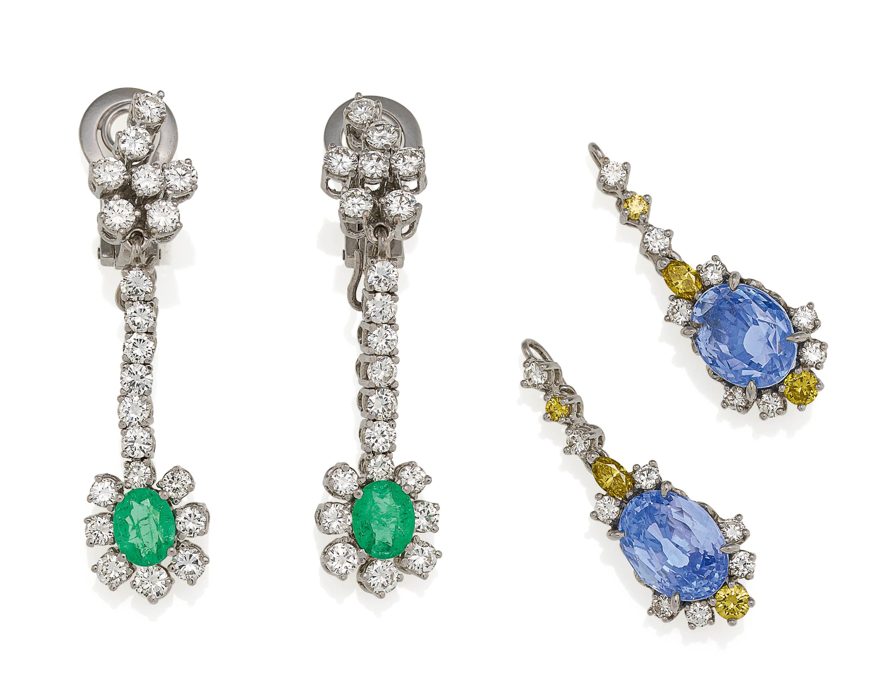 Edelsteine: 2 ovale, facettierte Saphire, wohl Sri Lanka, ca. 5,1 und 4,8 ct., 2 ovale, facettierte Smaragde zus. ca. 1,1 ct.