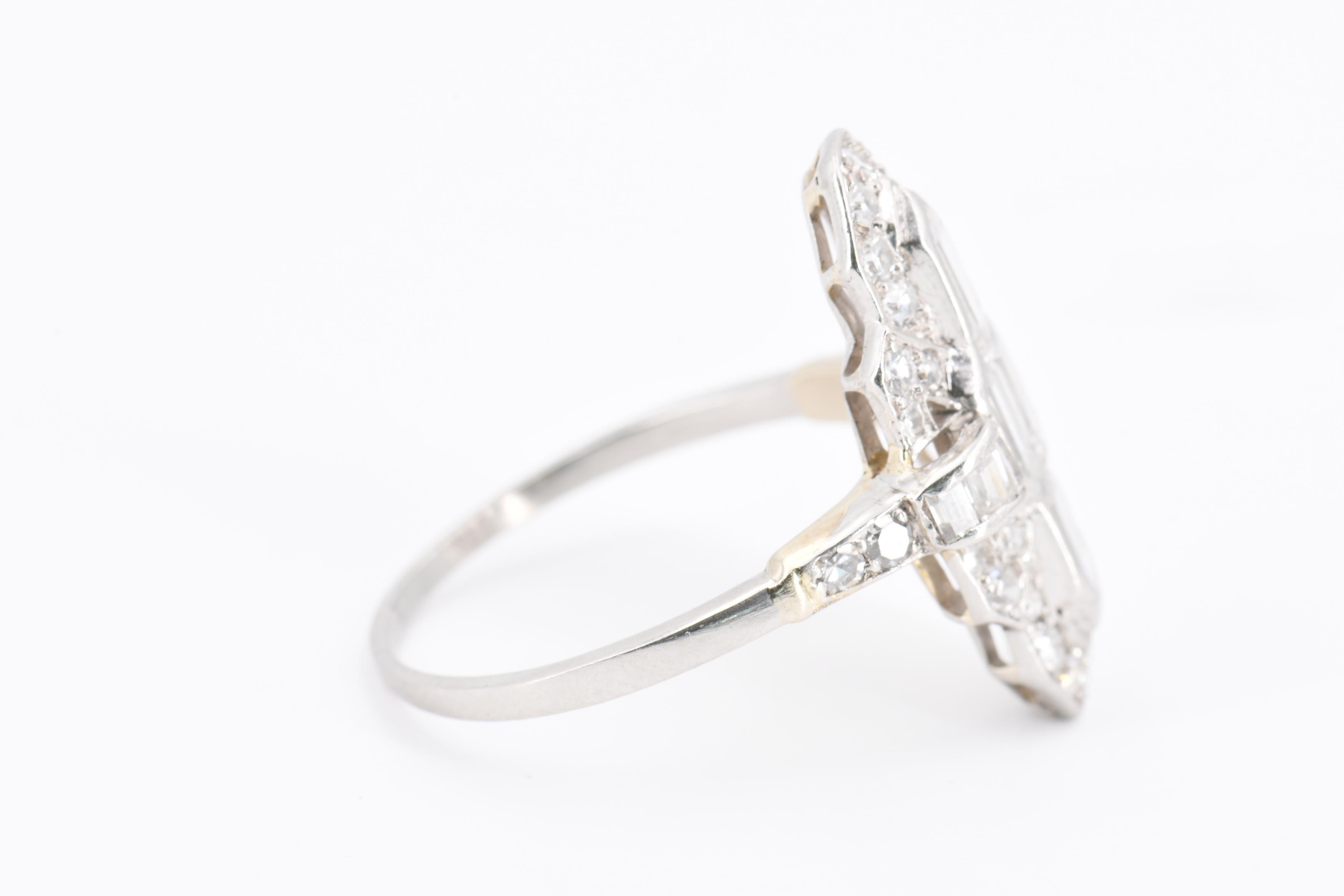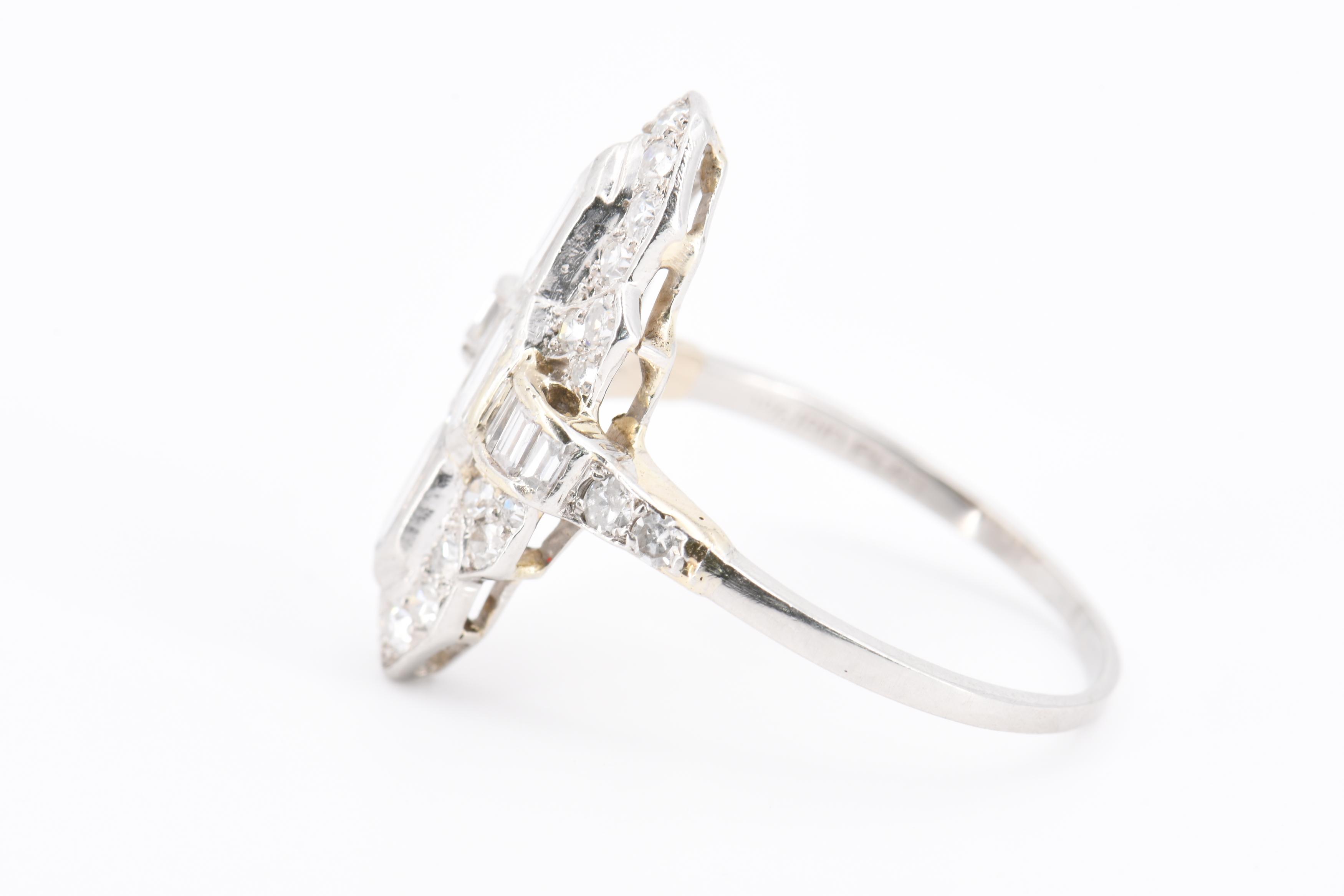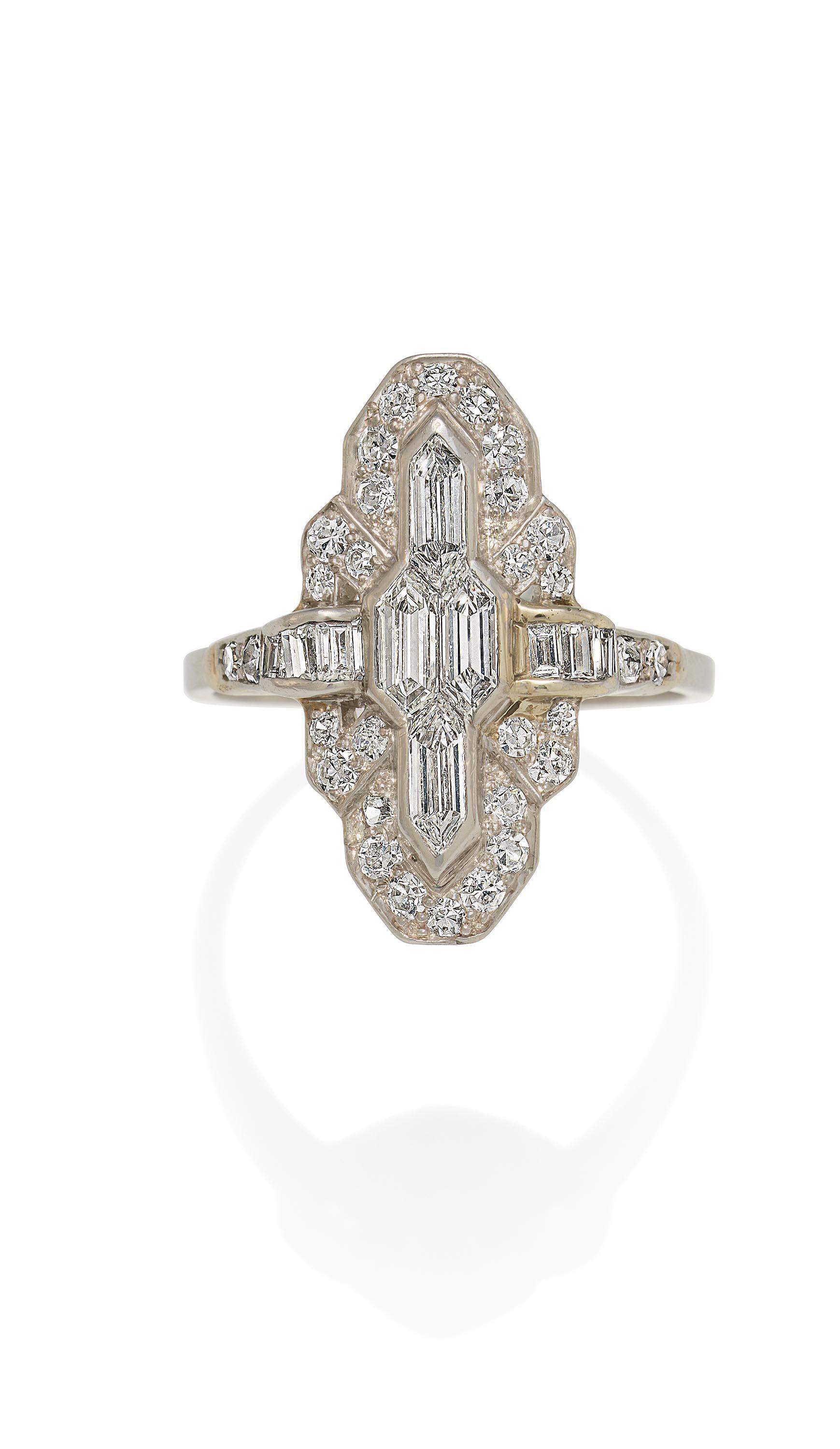 Diamanten: 4 hexagonale, geschliffene Diamanten, 6 Diamanten im Baguette-Schliff, 29 Diamanten im Achtkant-Schliff, zus. ca. 1,1 ct., G-I/VS-SI.