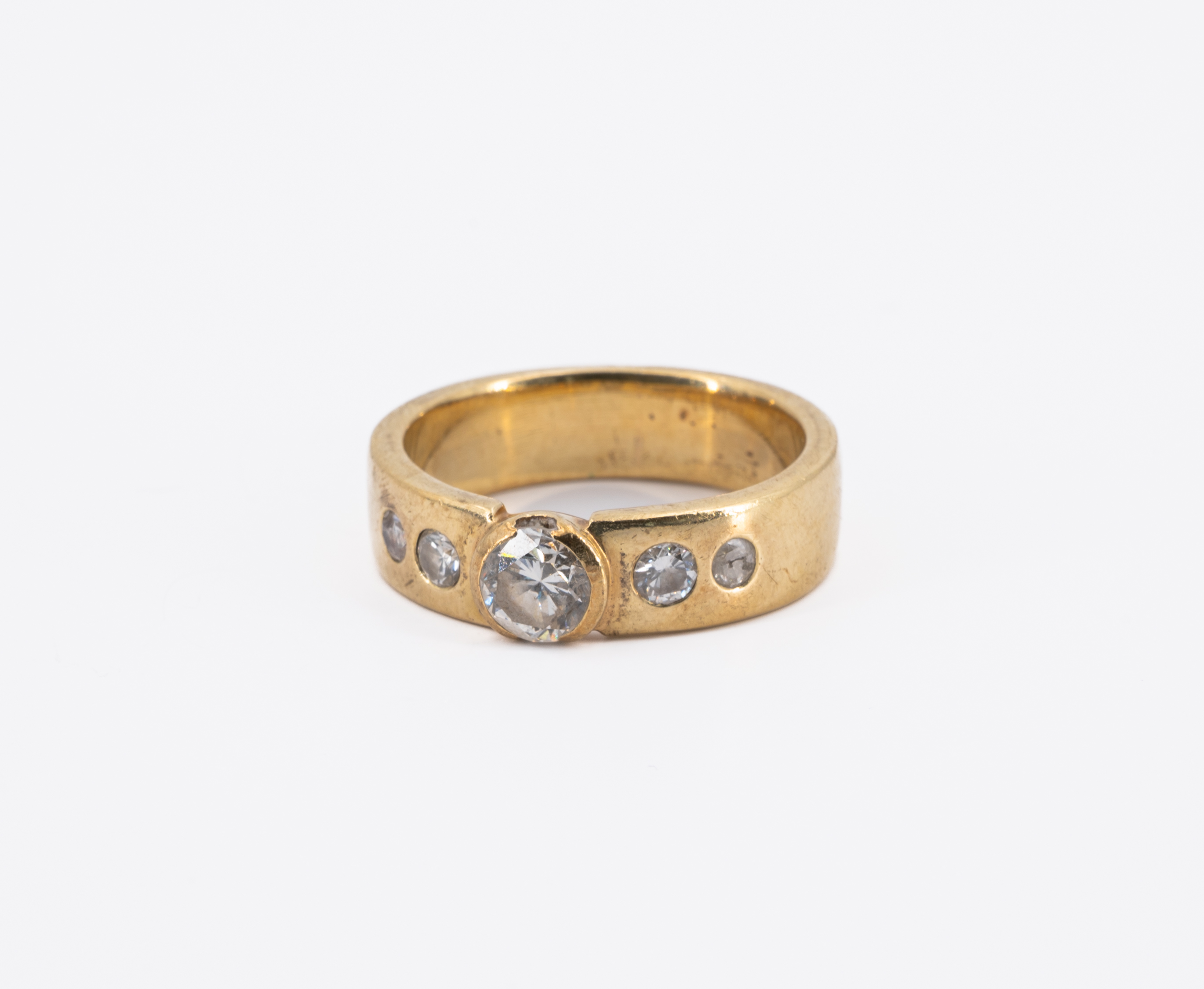 Diamanten: 1 Brillant ca. 0,5 ct., L/P1, 4 kleine Brillanten Ø ca. 2,3 - 2,6 mm.