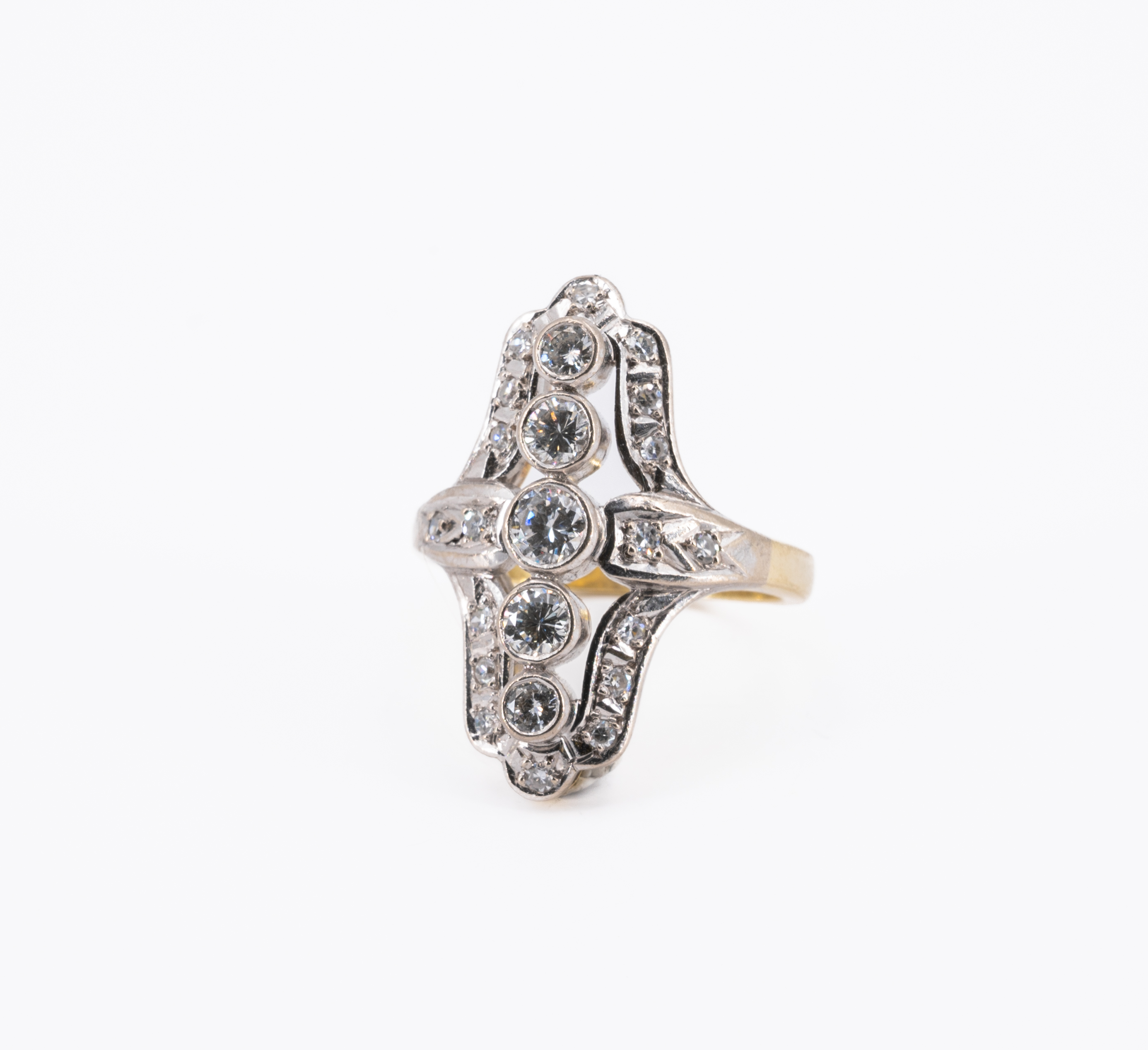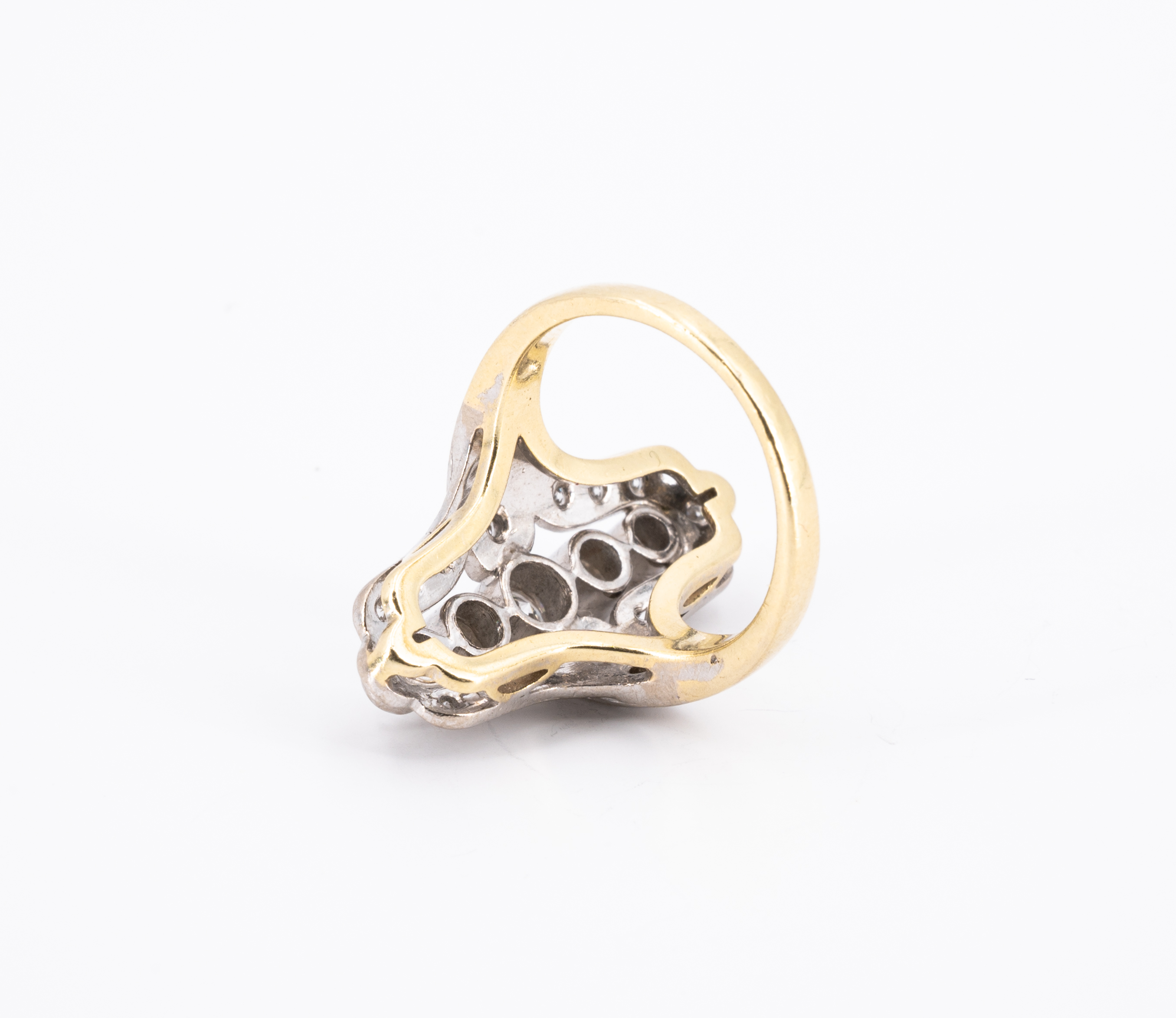 Diamanten: 5 Brillanten zus. ca. 0,5 ct., schöne Qualität, 18 kleine Diamanten im Alt-Schliff Ø ca. 1,6 - 1,8 mm.