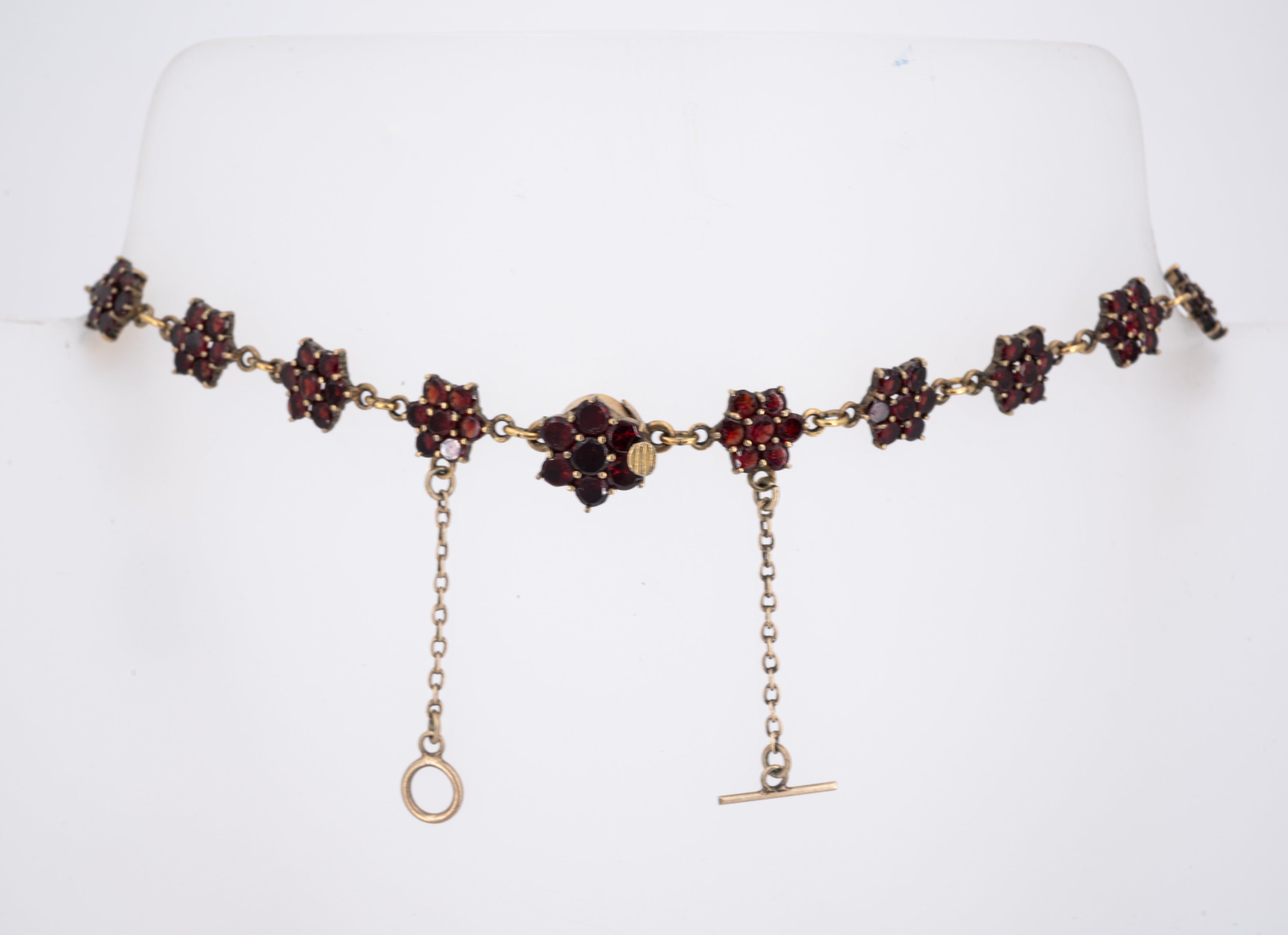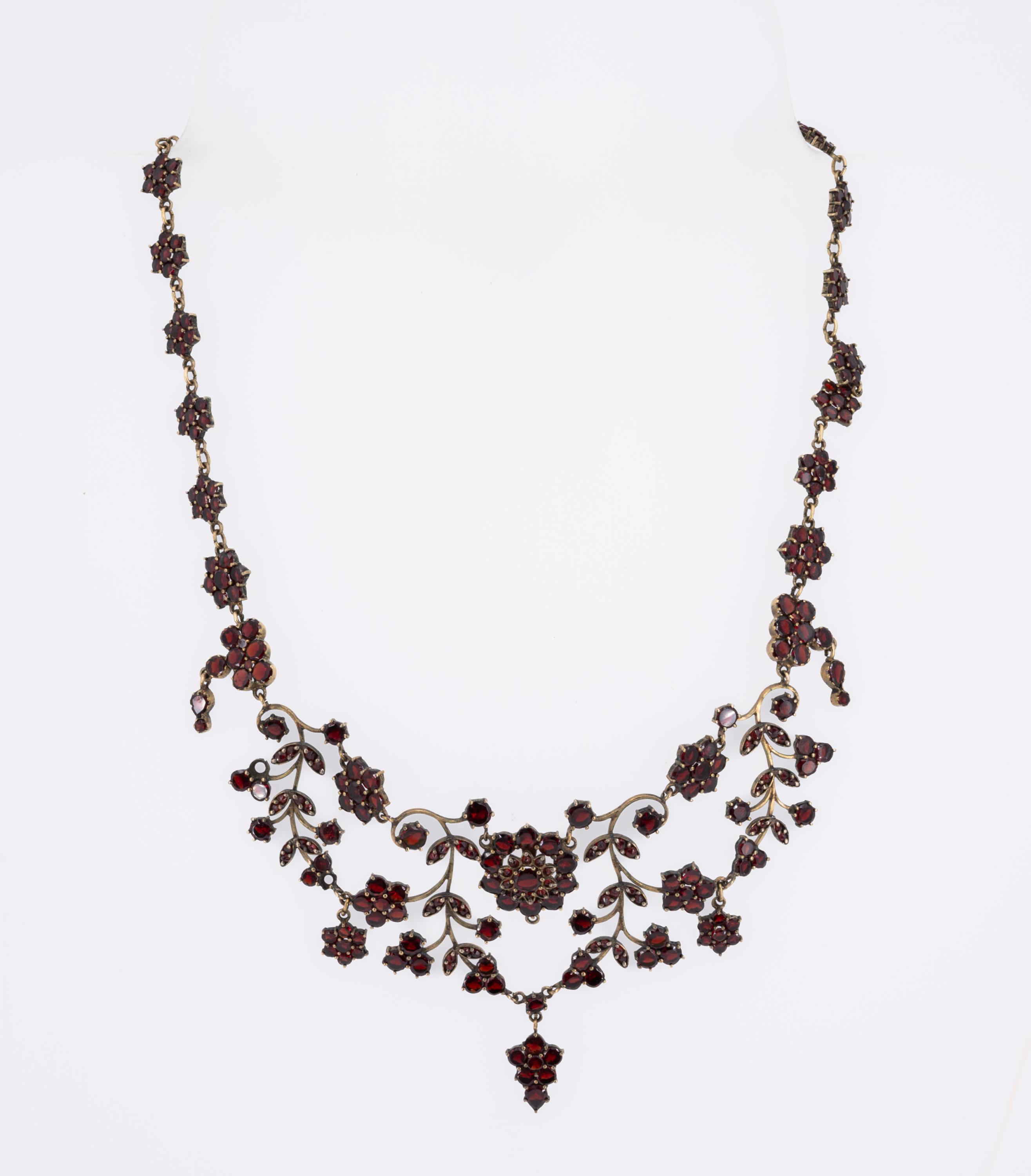 GRANAT-GOLD-KONVOLUT: COLLIER, RING, 4 BROSCHEN, OHRSCHMUCK, HAARSCHMUCK.