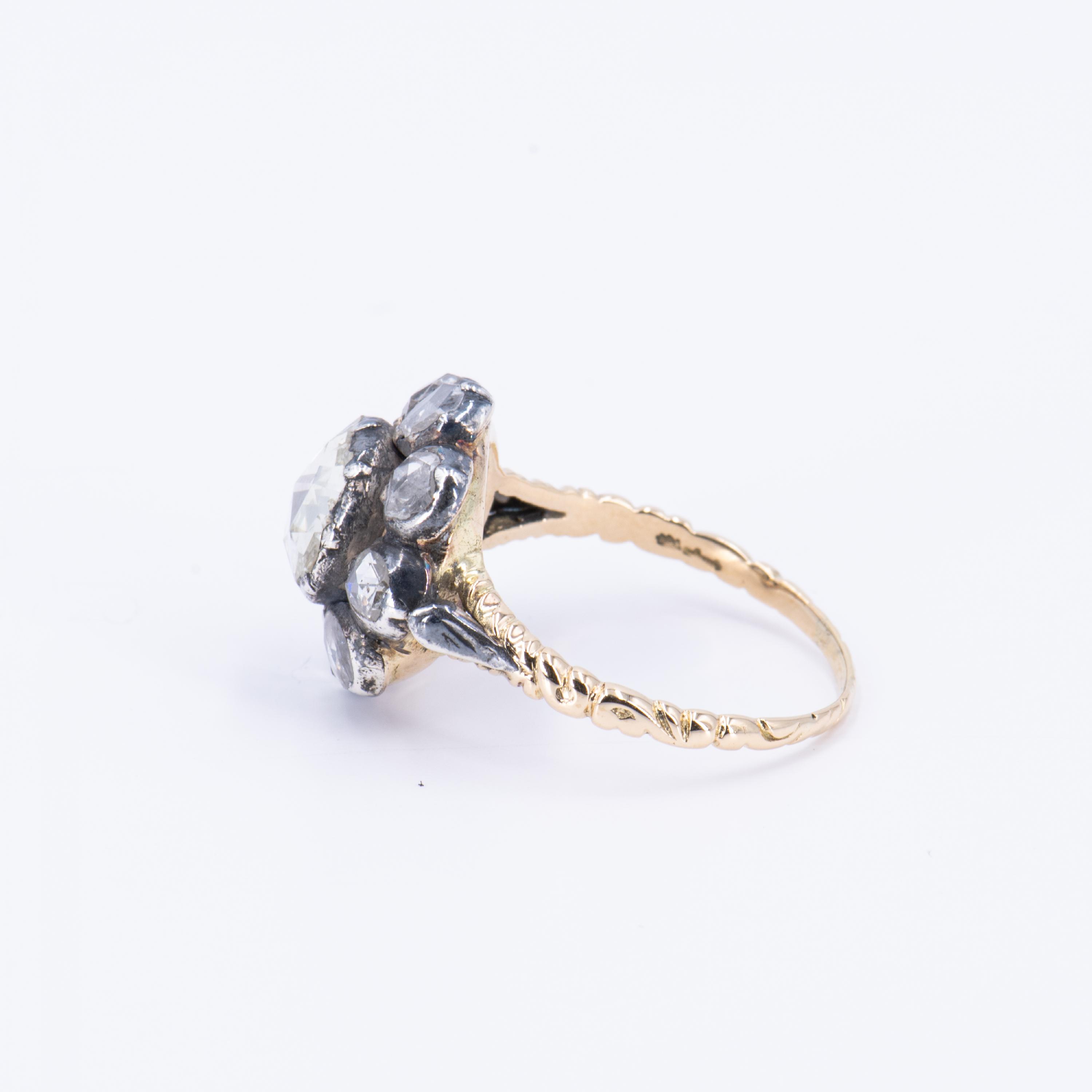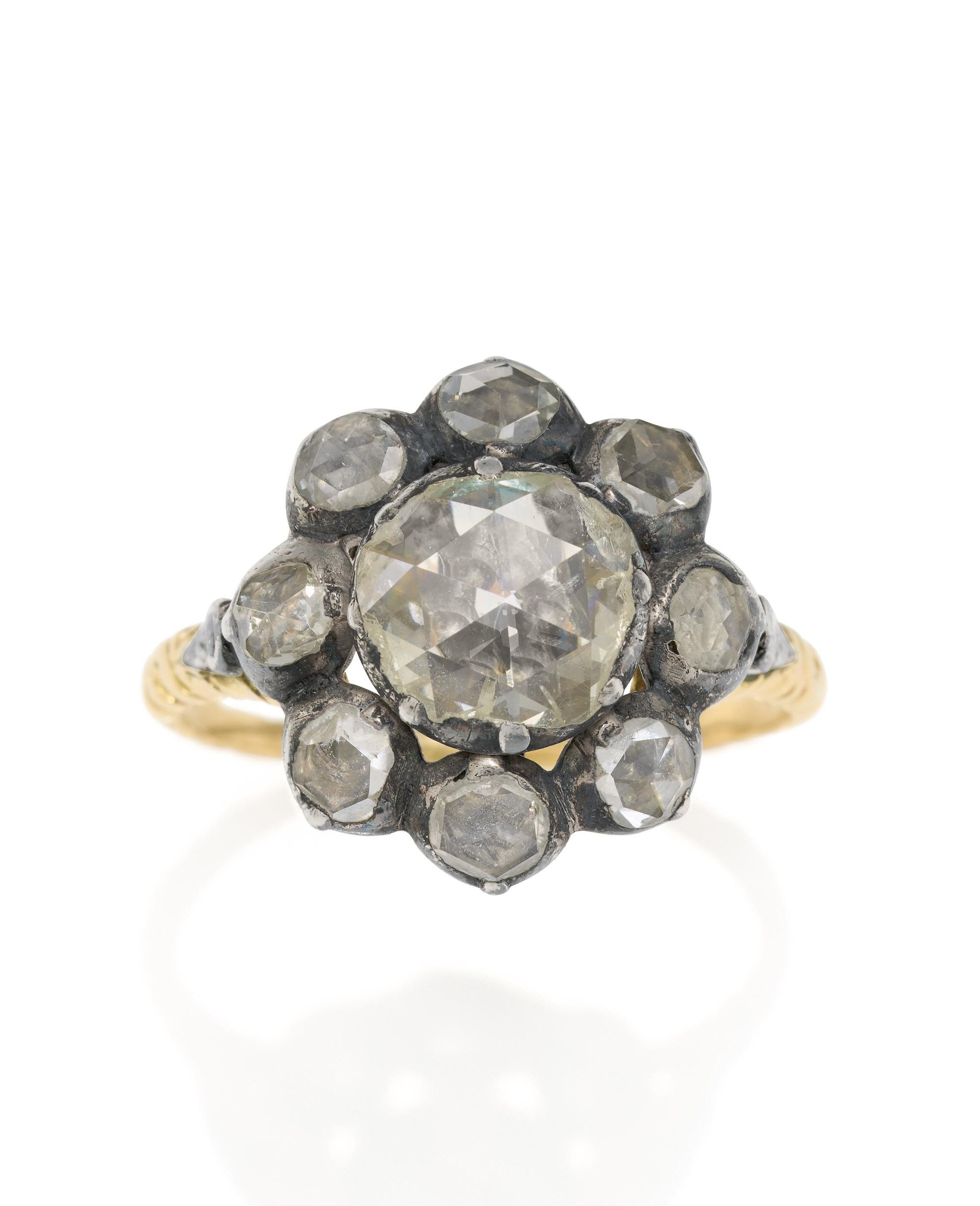Diamanten: 1 Diamant im Rosen-Schliff ca. 1,4 ct., O-P/P, an einer Seite beschädigt, 8 Diamanten im Rosen-Schliff zus. ca. 0,65 ct.